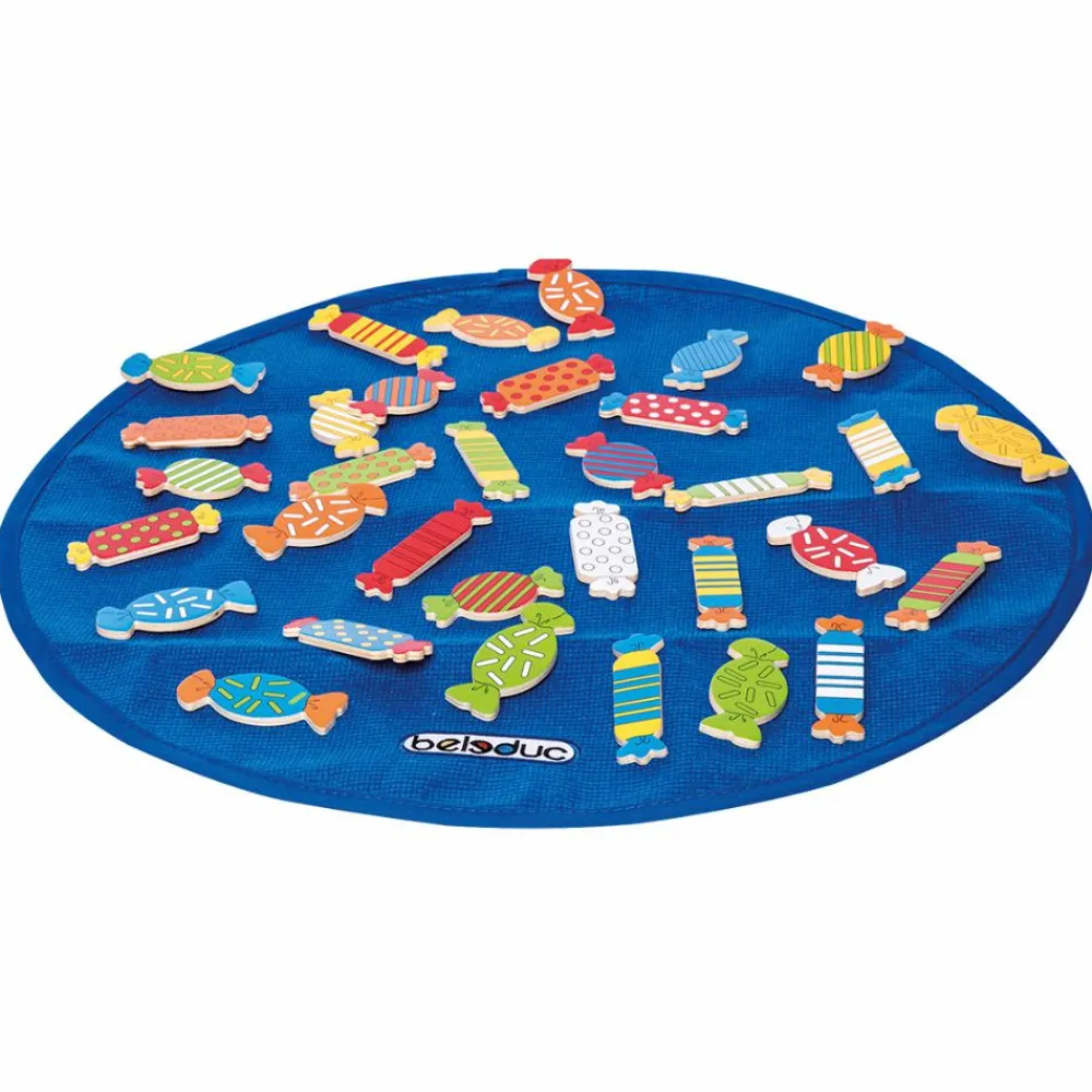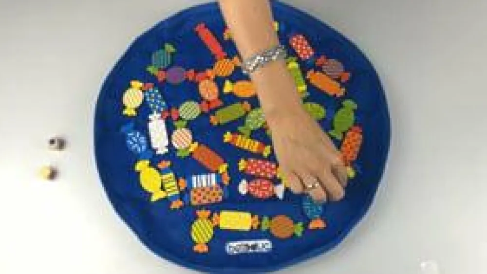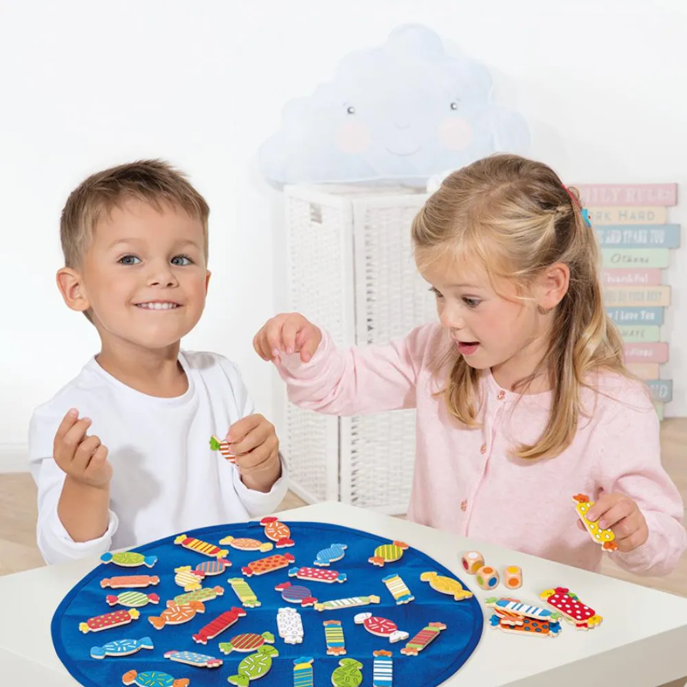 Der er flere mulige spil, hvor I fx spiller med enten at samle slik eller komme af med jeres slik eller skiftes til at beskrive et stykke slik, som de andre så skal genkende i mængden.