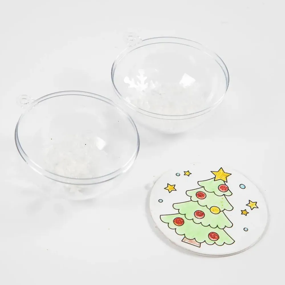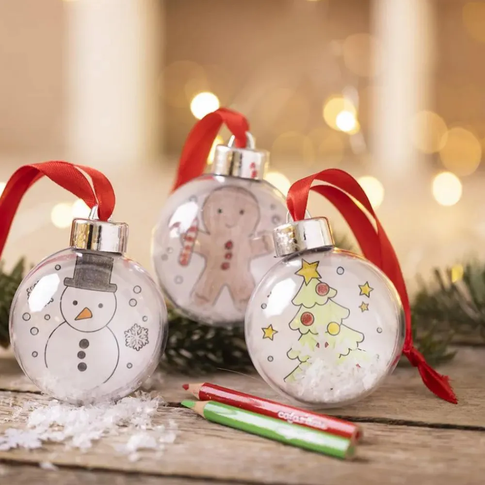 Lad dit barn selv tegne de fine tegninger og lægge dem i plastkuglerne. Dekorer med glimmerlimen, så det bliver ekstra fint.