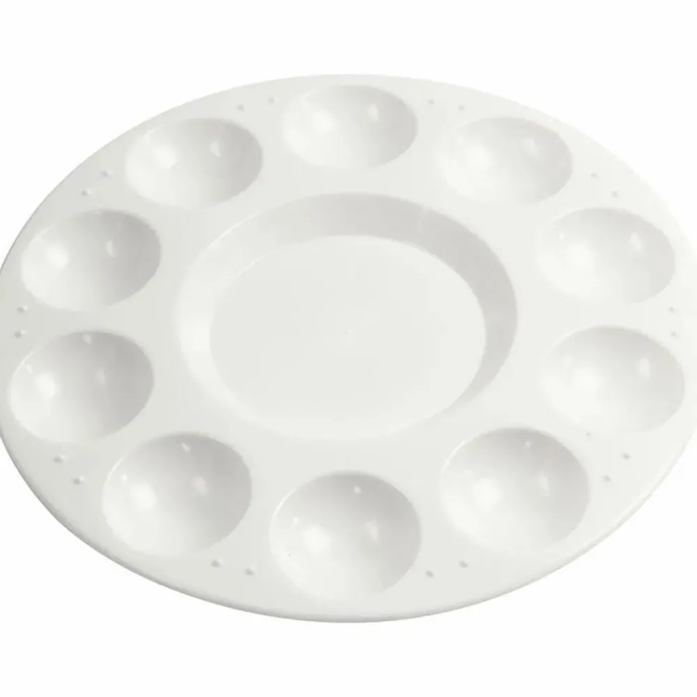 På denne malerpalette er der 10 små rum og et stort til at blande farver.