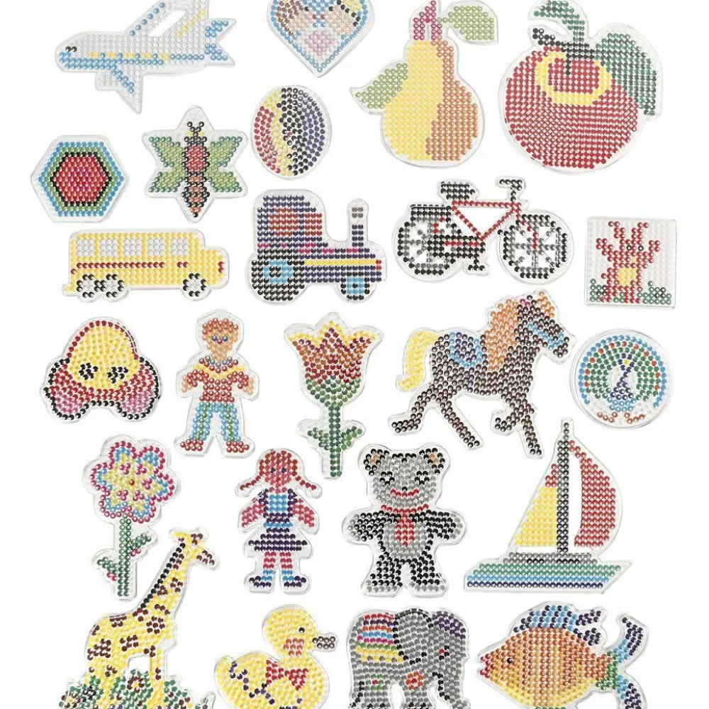 Stor pakke med 24 forskellige gennemsigtige perleplader. Det smarte ved at de er gennemsigtige er, at det er muligt at placere en skabelon under. Så kan dit barn se helt præcist, hvor de forskellige perler skal være.
