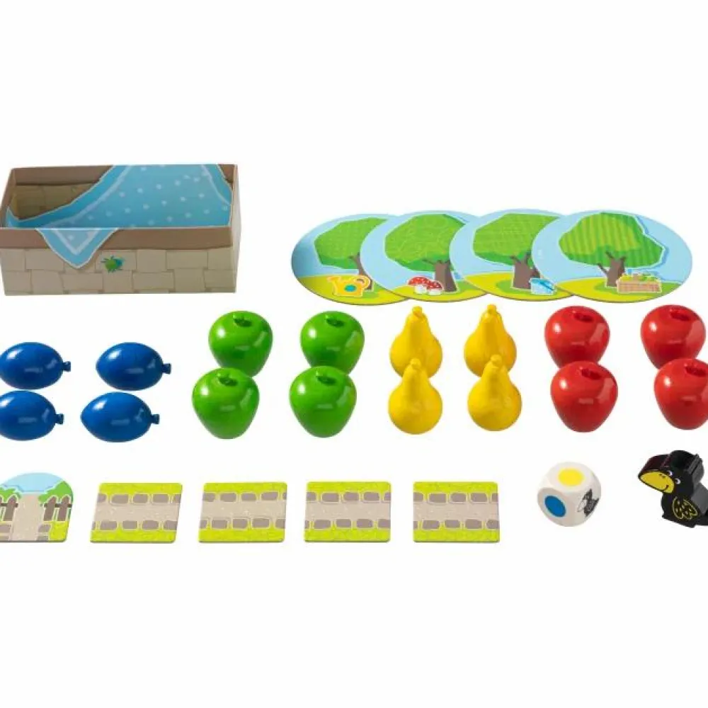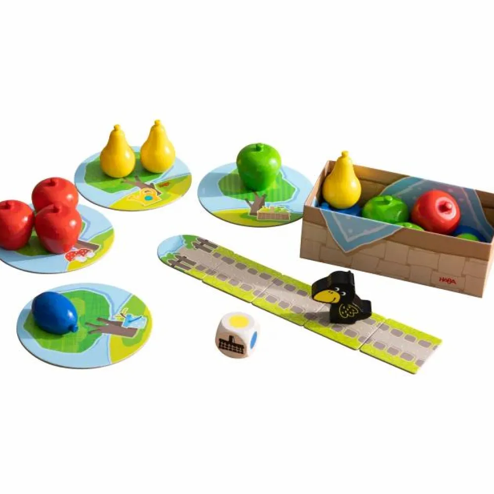 Rul med terningen og se, om du må høste frugten og lægge den i kurven, eller om ravnen må rykke et felt tættere på træerne.