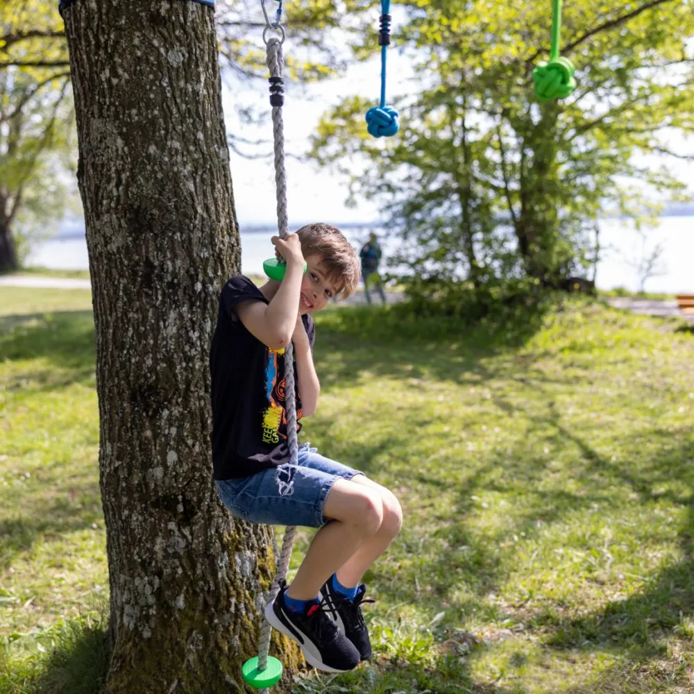 Hæng klatrerebet op i vores jungle line mellem to stærke træer eller hæng den i et stabilt gyngestativ.