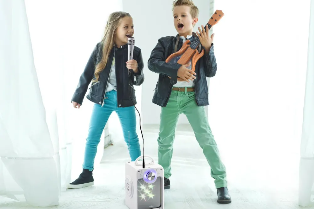Med denne fine karaoke-højtaler kan børn ned til 3 år både selv lytte til den musik, de vil, skifte musik og synge til i mikrofonen, mens et flot lysshow blæser derudad.
