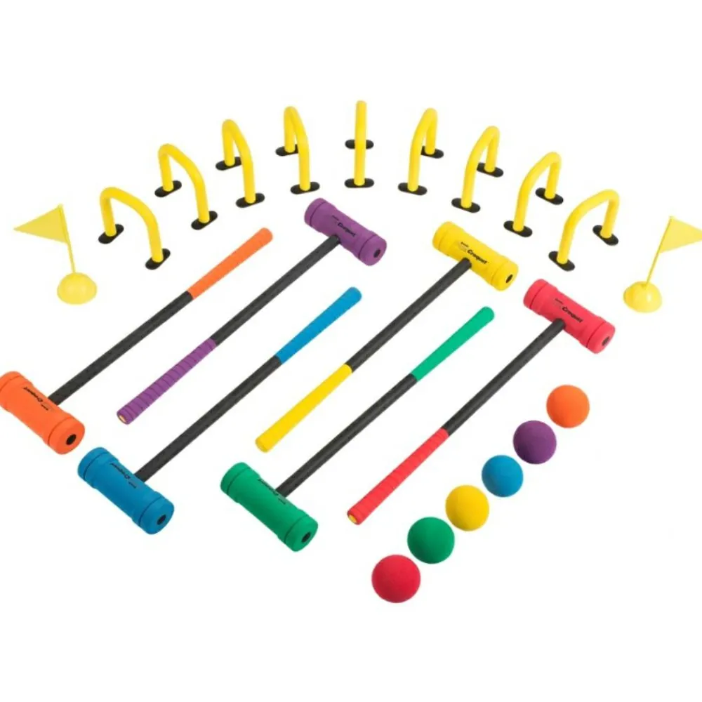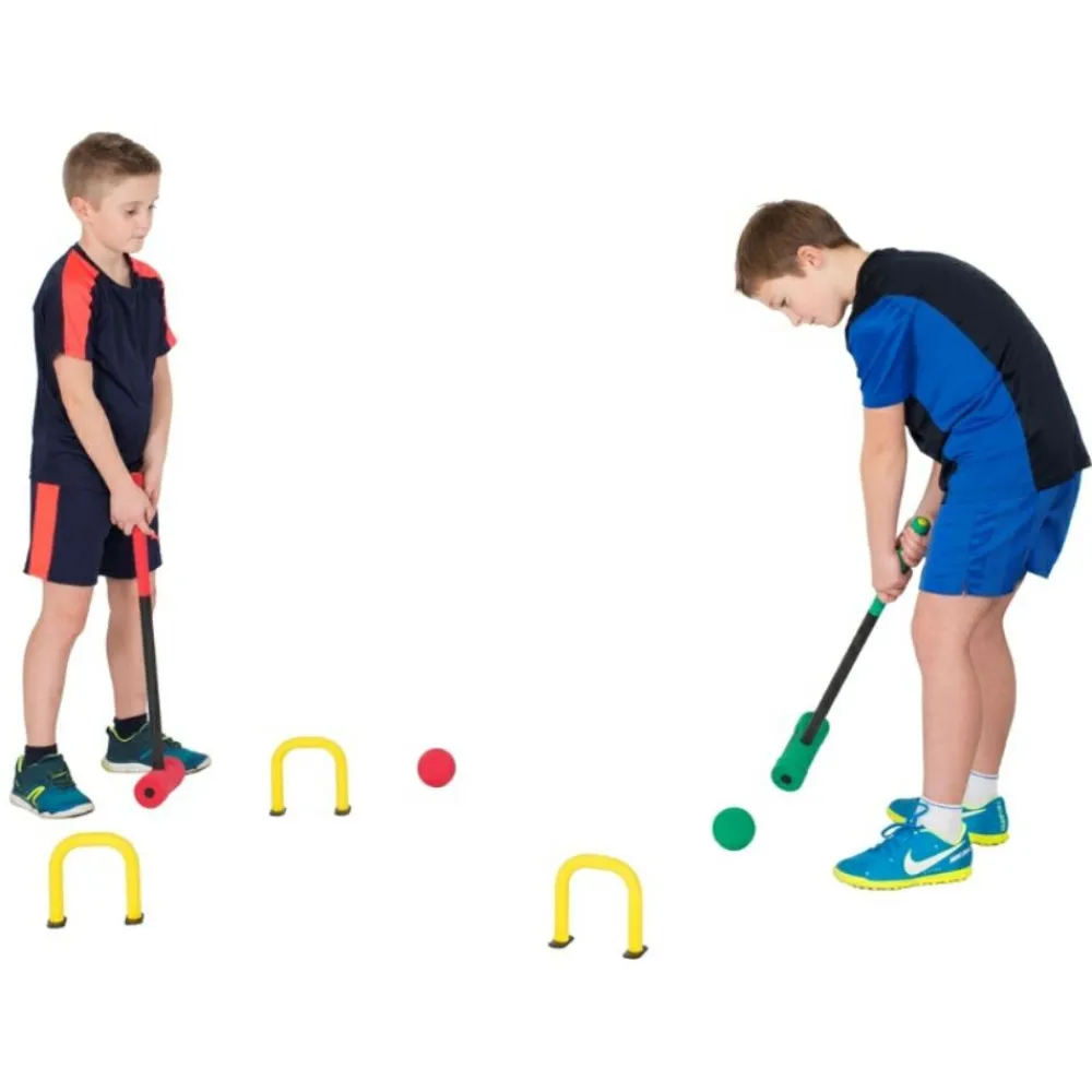 Indendørs kroket bliver muligt med sættet her, for køllerne .. hedder de i virkeligheden køerne? Nå de er i hvert fald af skum og det er boldene også. De matchende farver sikrer, at det er nemt at huske, hvis bold der er din.