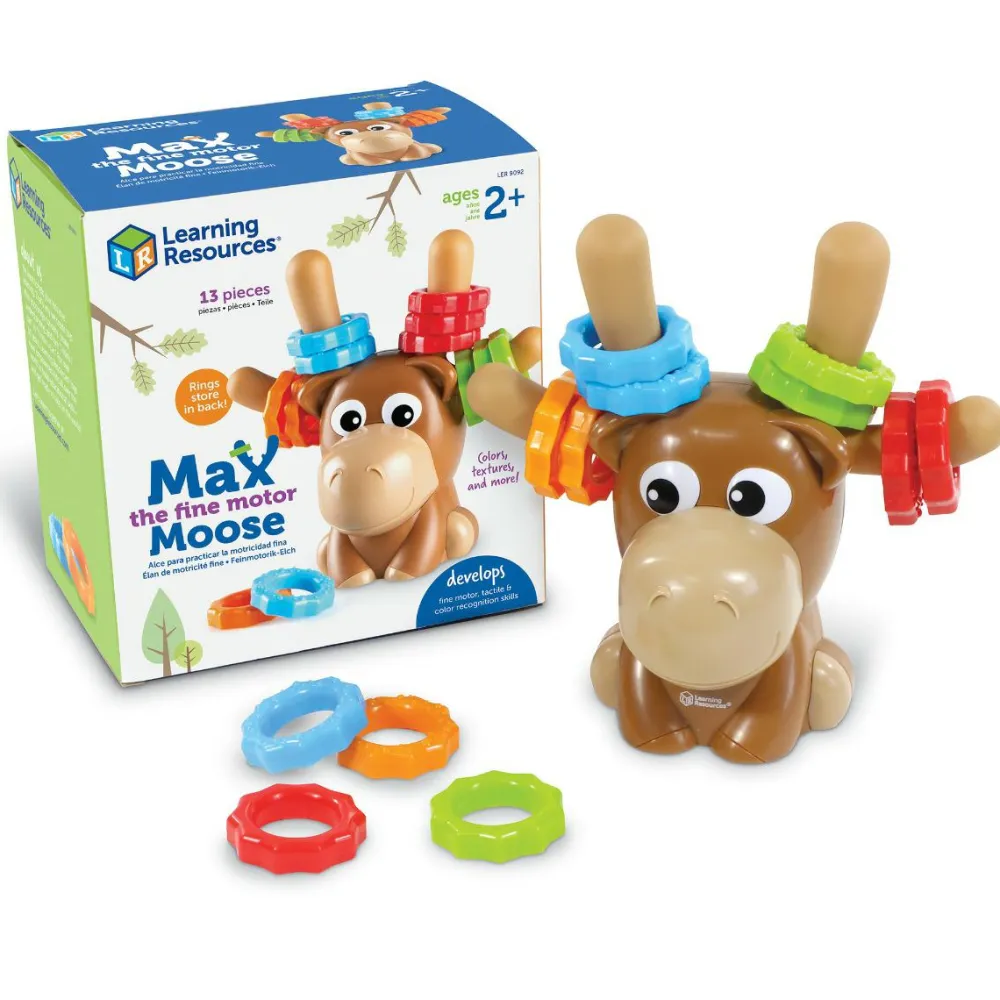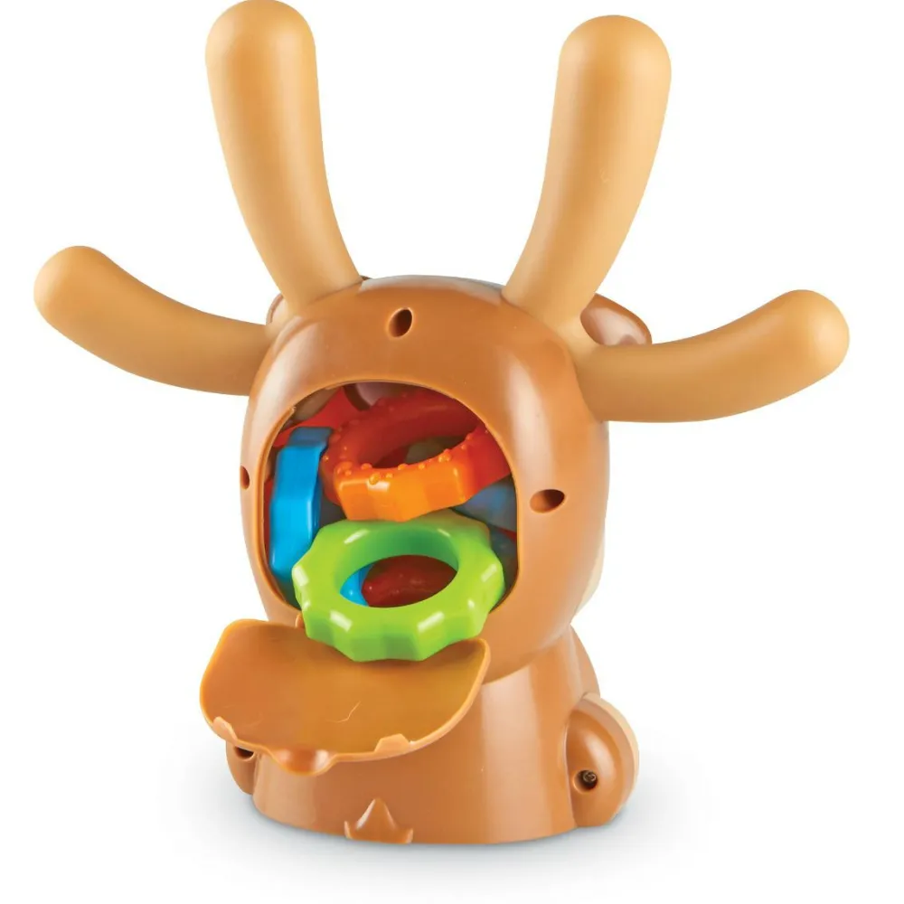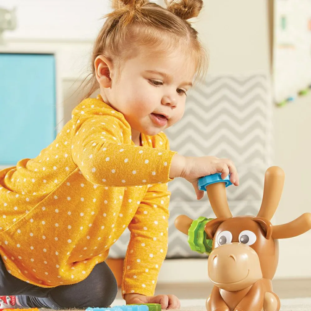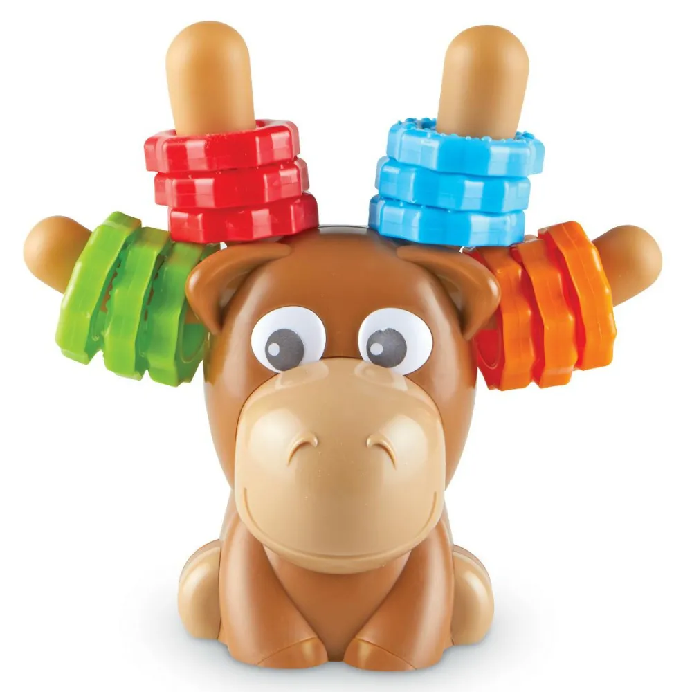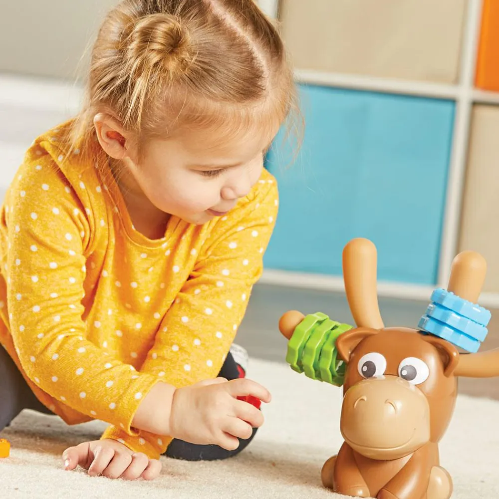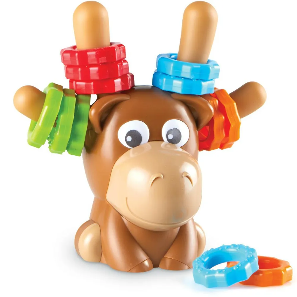 Se om dit barn begynder at farvesortere ringene. Måske er det sjovere at bruge elgen som ringspil, hvor ringene skal kastes efter geviret. Eller måske finder I på en leg, hvor I med lukkede øjne skal mærke, om ringen er glat eller nupret. Eller en gætteleg, hvor man skal regne ud, hvilken ring, der mangler, hvis du fjerner en af dem mens dit barn kigger væk.