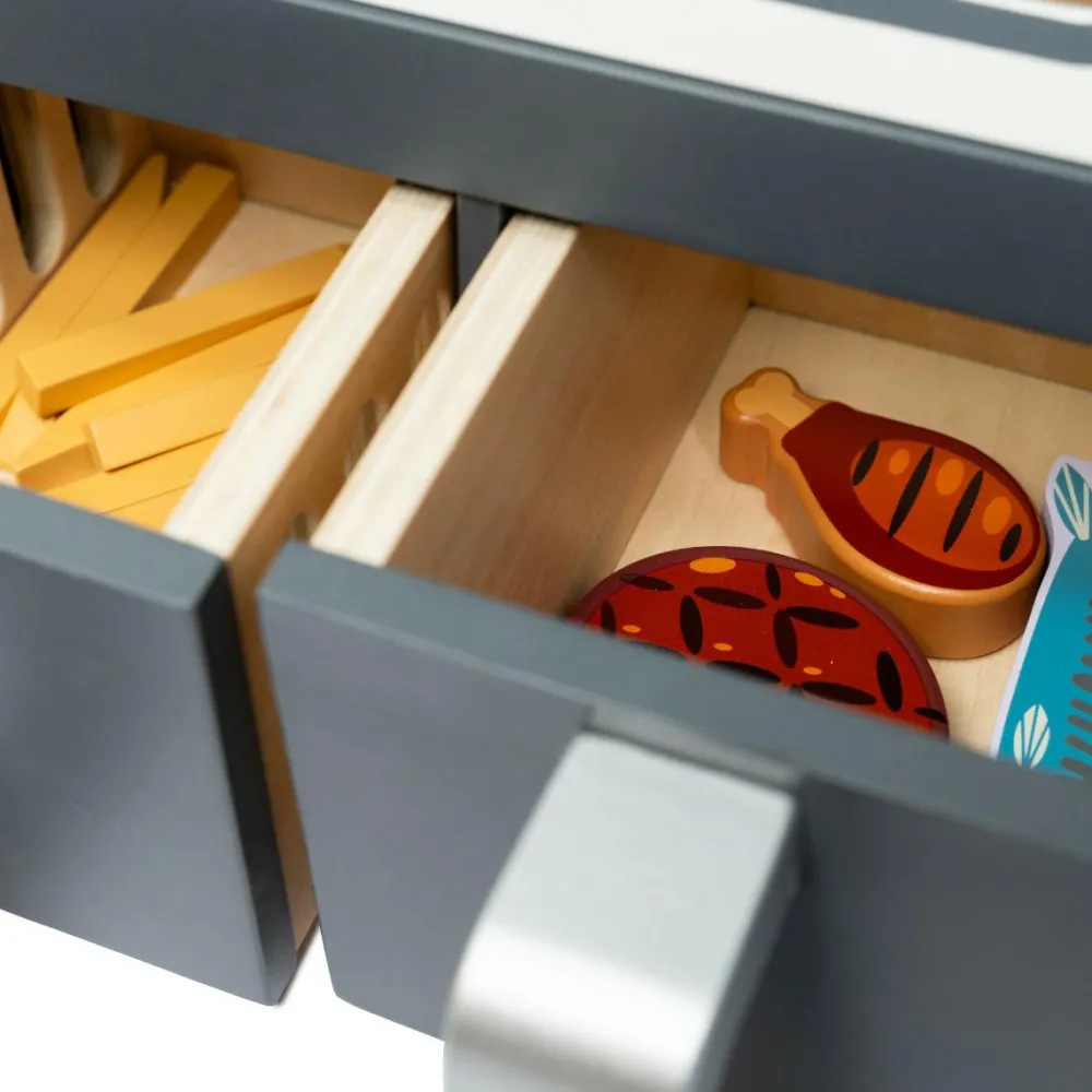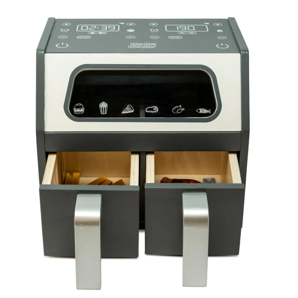 Lækker lege-airfryer med display og to skuffer, som dit barn kan tage ud og fylde med legemaden, der følger med. Der er en skuffe med lukkede sider og en skuffe, der passer godt til pomfritter.