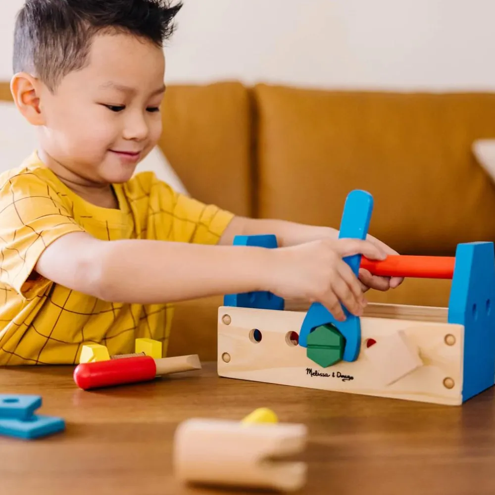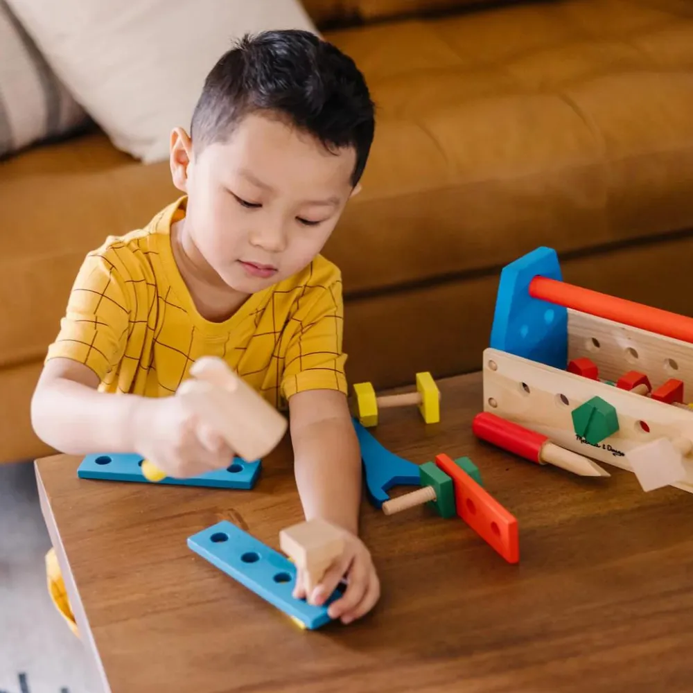 Delene er i forskellige farver, således at man kan tilføje en farvesorteringsleg. Ligeledes kan dit barn lære at identificere hver type værktøj samt man kan tælle huller i pladerne, som er forskellige eller skrue dem sammen og på den måde tælle antal, hele, halve og kvarte.