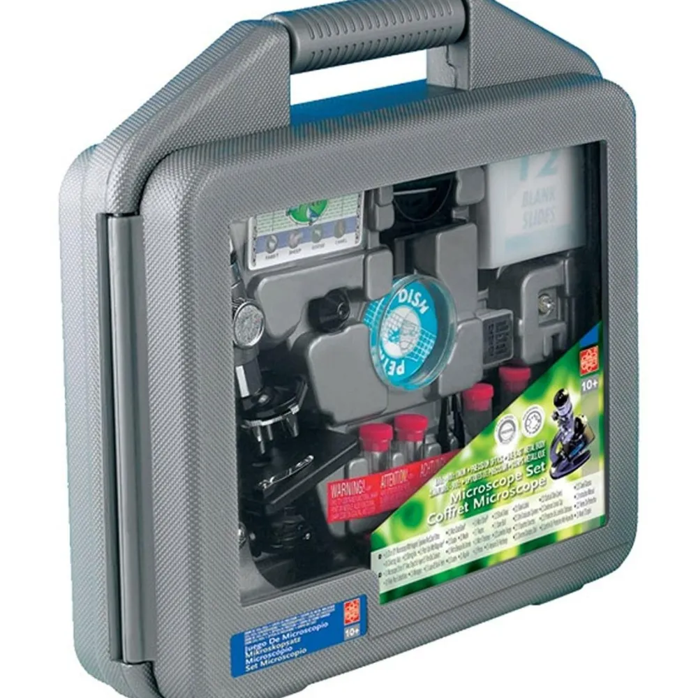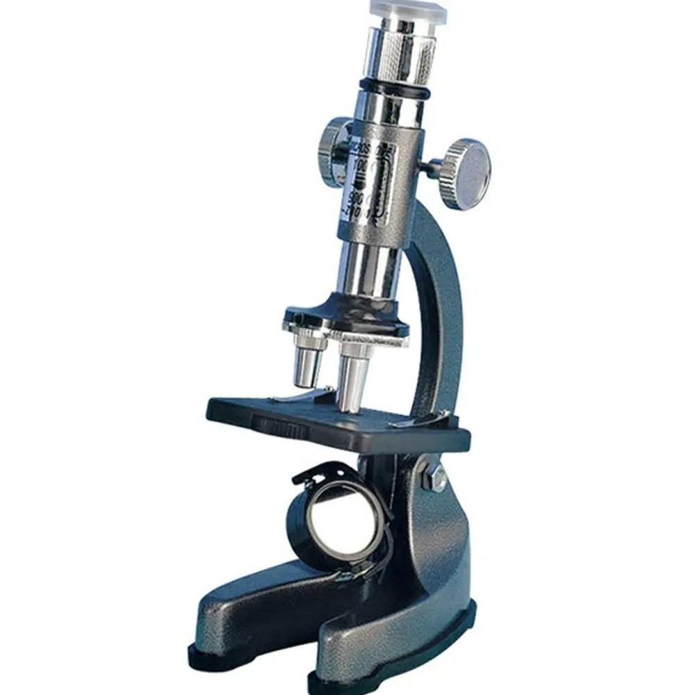Metalmikroskop med lys, der kan forstørre op til 1200 gange i interval fra 100-200x, 300-600x og 600-1200x. Mikroskopet ligger i en smart kasse, der både kan bruges til opbevaring og til transport af mikroskopet, hvis I skal på ekspedition.