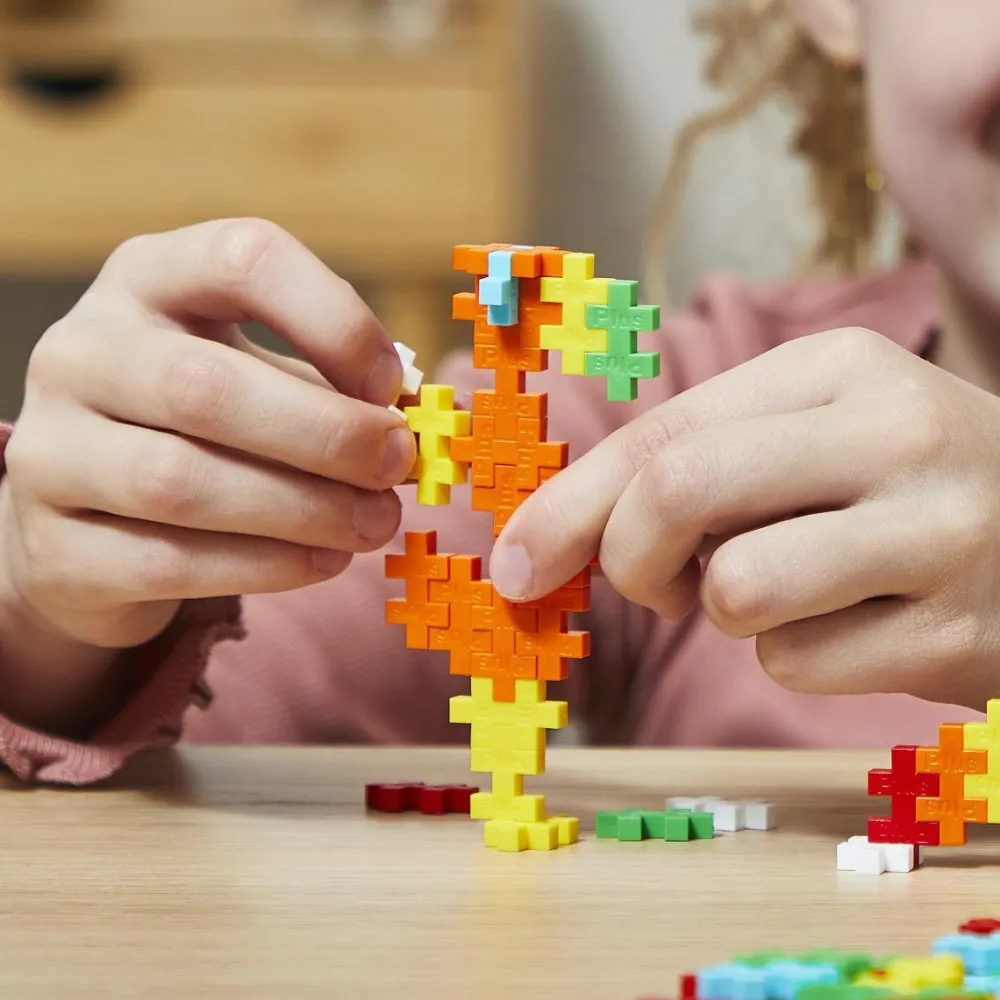 Formen som små plus-tegn kan sættes sammen på alle leder og kanter – og de du kan vælge små (2 x 1,2 x 0,4 cm) eller store (5 x 3 x 1 cm) brikker i et væld af farver. Skønt konstruktionslegetøj, som de fleste børn elsker. Byggeleg med Plus-Plus gavner ungernes sans for logik og geometri. Find et væld af vejledninger og inspiration til at lave byggerier med Plus-Plus på fx YouTube.