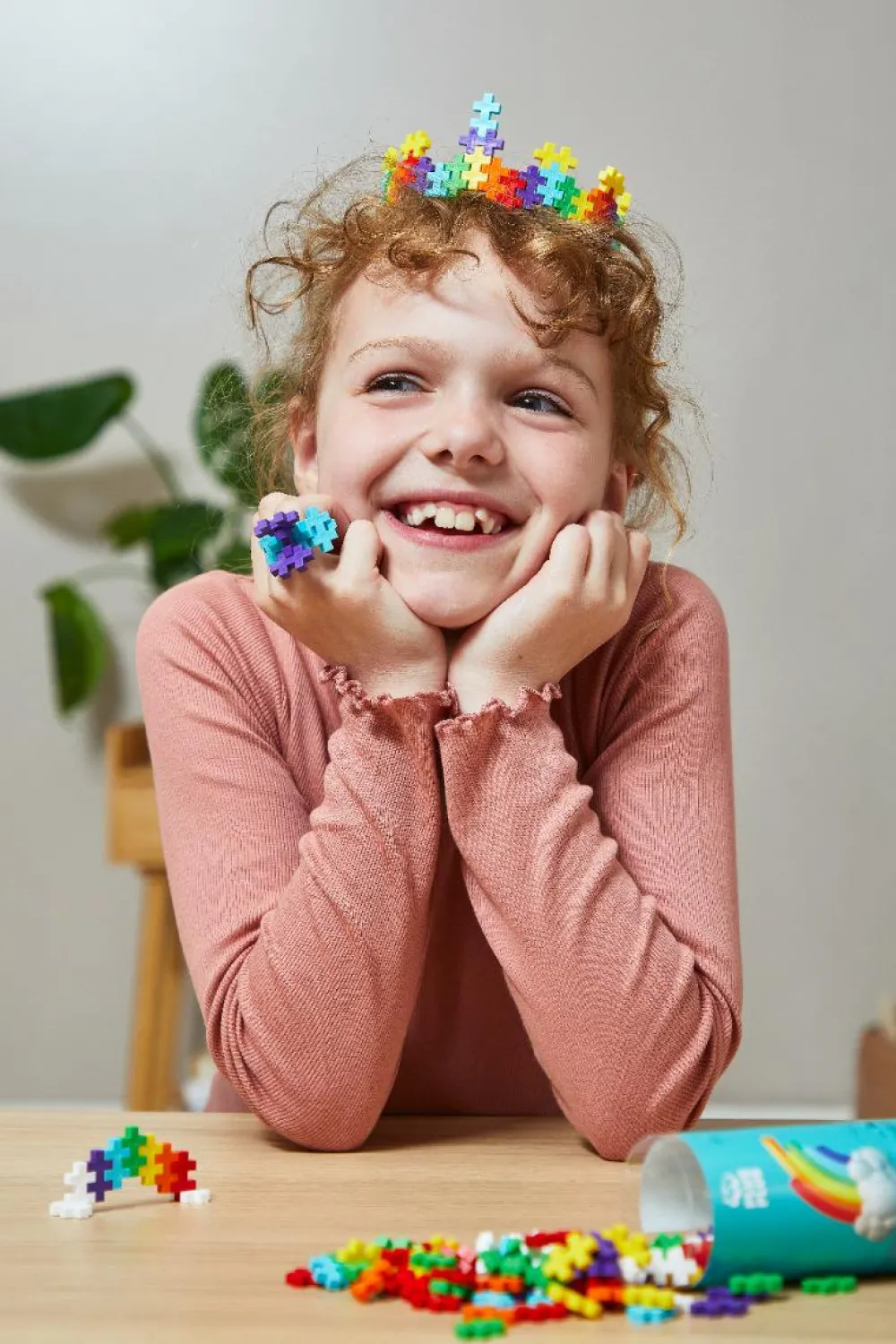 Et rør med 240 stk af de herlige, dansk designede Plus-Plus® i klare regnbuefarver.