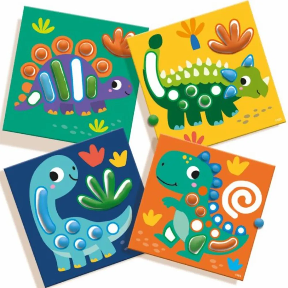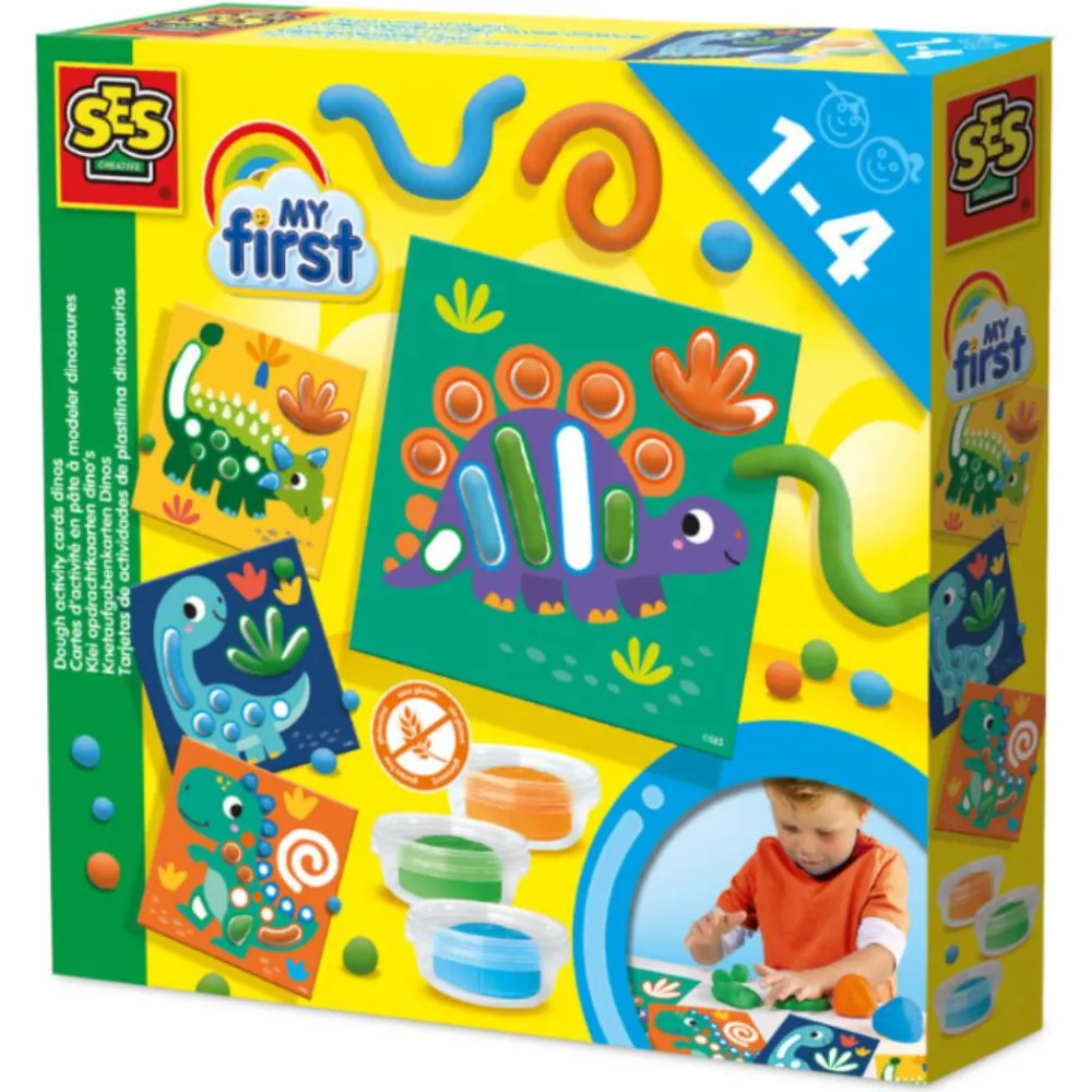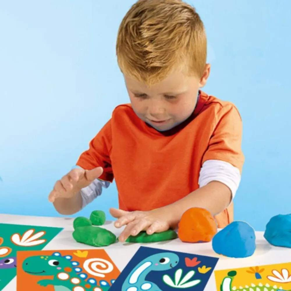 Der er 40 gram af hver af de tre farver modellervoks og fire kort med søde dinosaurer, der ser frem til at få lidt ekstra farver på i samme former, som de hvide markeringer.