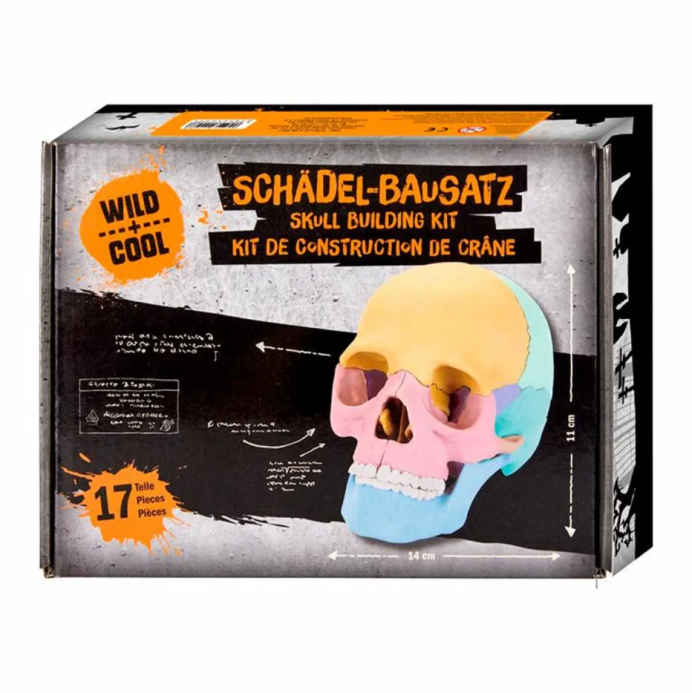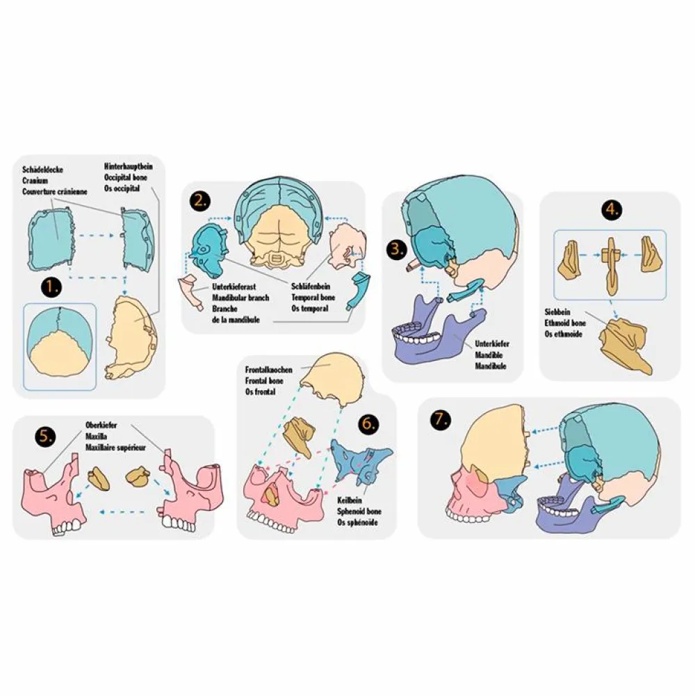 De 17 dele har fine pastelfarver og der medfølger 10 kort på engelsk, tysk og fransk med information om kraniets dele og hvordan de samles.
