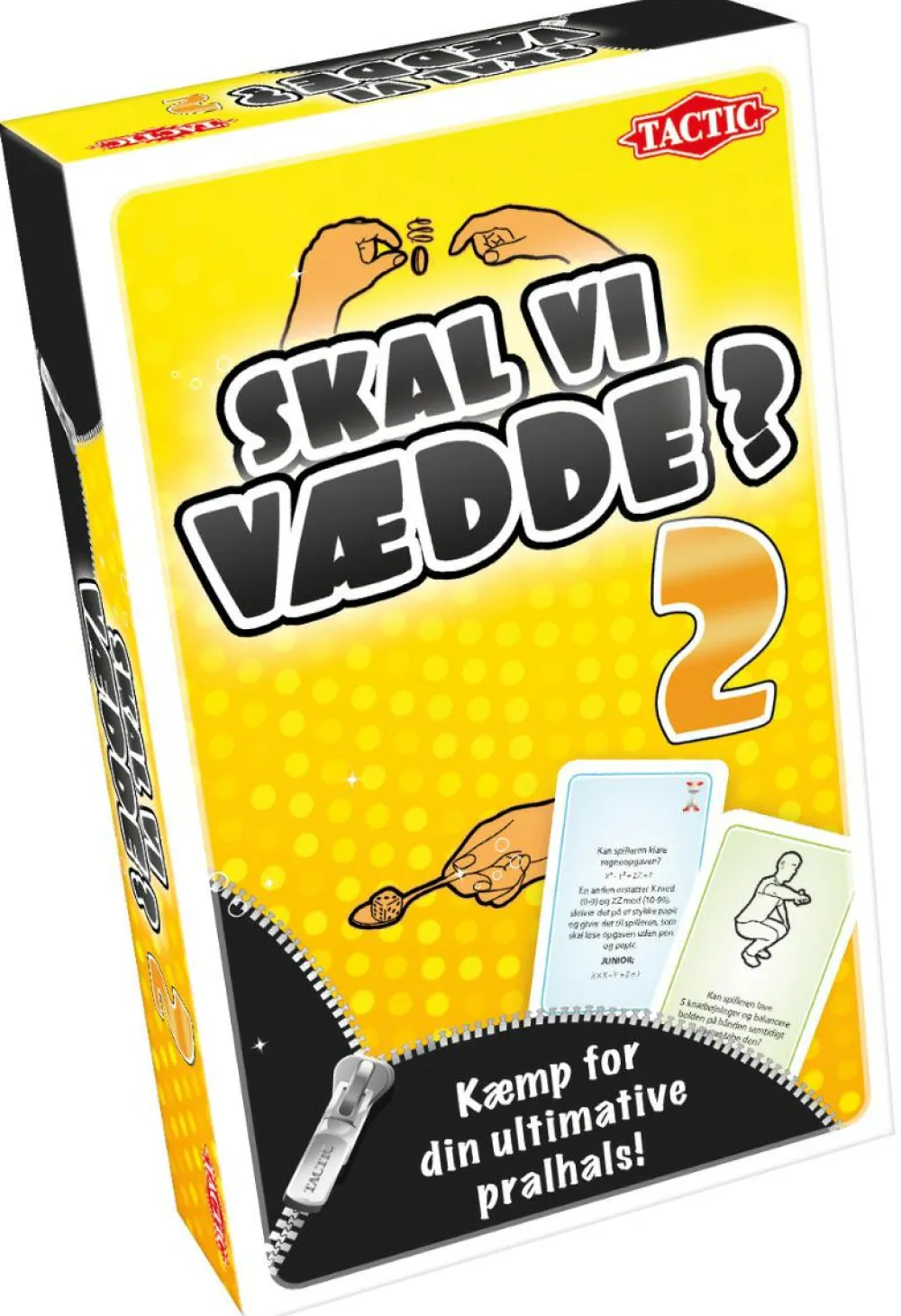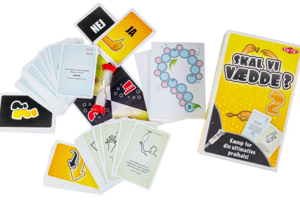 Æsken indeholder 88 opgavekort, ja/nej kort, 1 blok med spilleplader, 1 notesblok og 1 stk 15 sekunders timeglas.