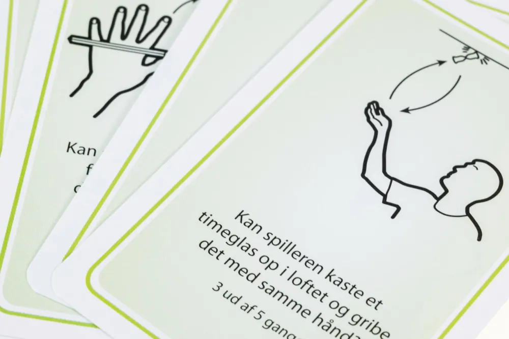 Opgaven kan fx være at lave en papirflyver, der kan flyve over 2 meter, skille en kuglepen ad med venstre hånd eller sige 4 ord, der rimer på “sæk”.