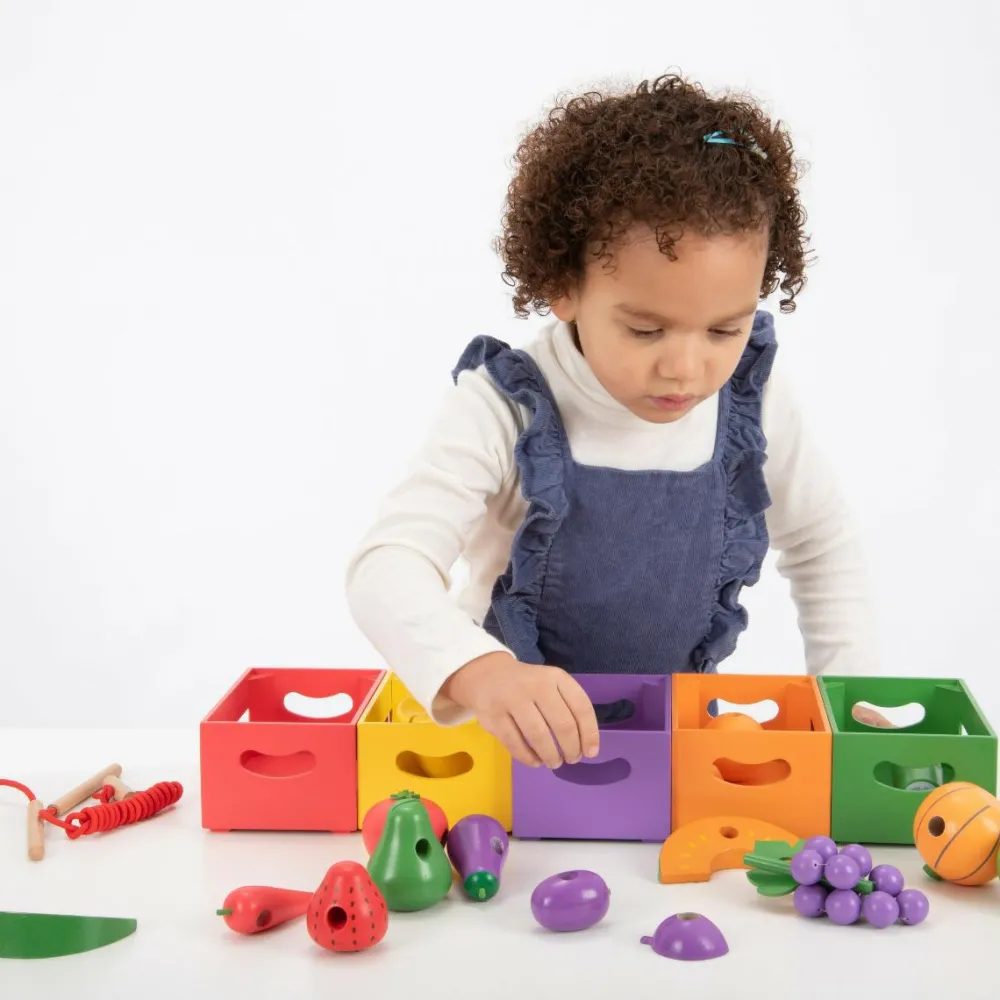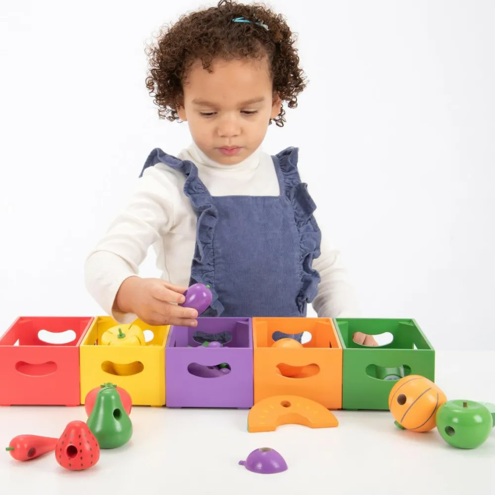 Mon dit barn lynhurtigt opdager, at man kan trække de små brikker på snoren? Eller er det mere spændende at tælle dem eller beslutte, hvilke af frugterne der smager bedst eller som dit barn ikke kan huske navnet på.