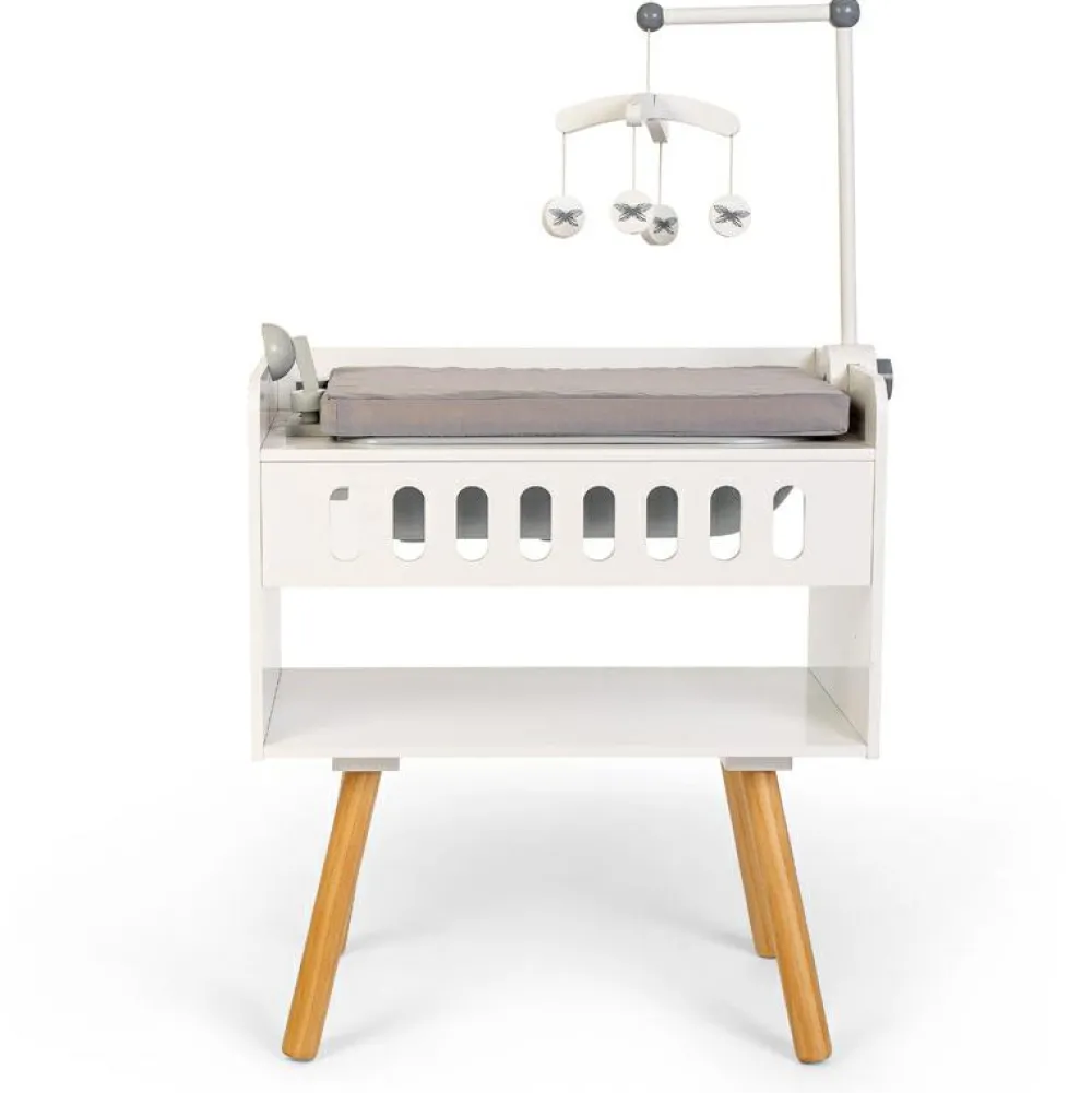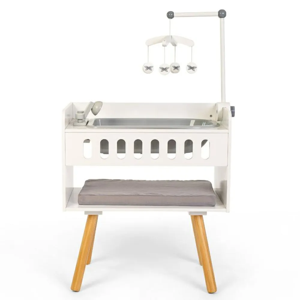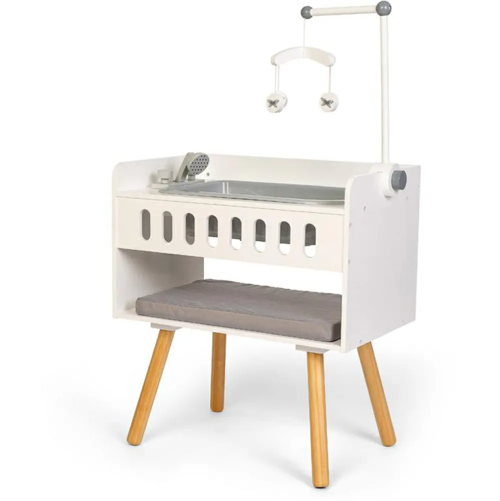 Her kan det lille dukkebarn få et bad i det dejlige badekar, der også har en håndbruser. Efter det dejlige bad kan den lille dukke blive puslet efter alle kunstens regler, og så kan den få fint, rent tøj på på puslebordet og ligge og kigge på den fine uro.
