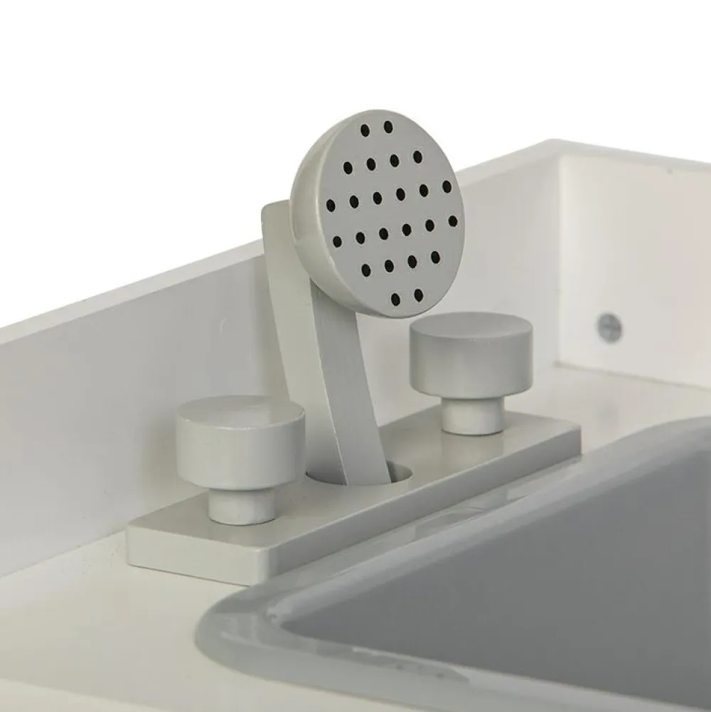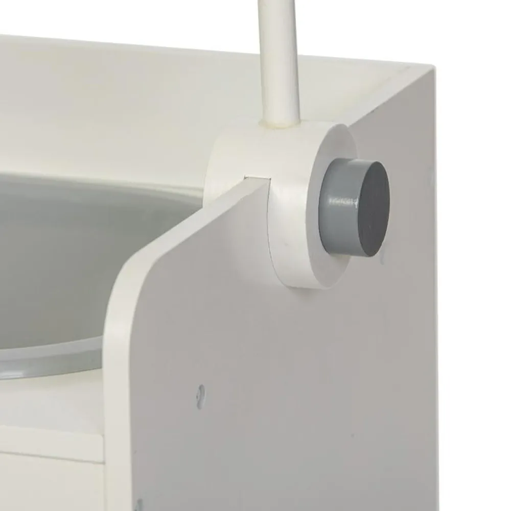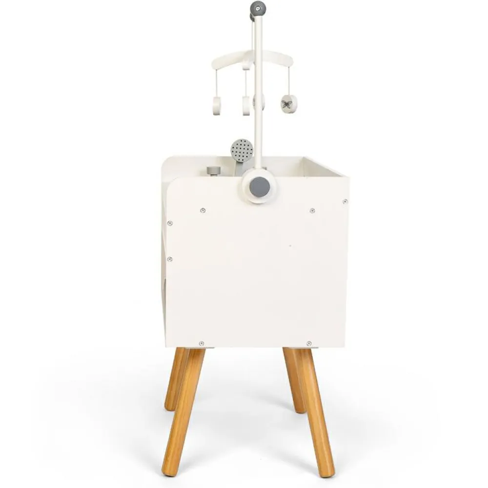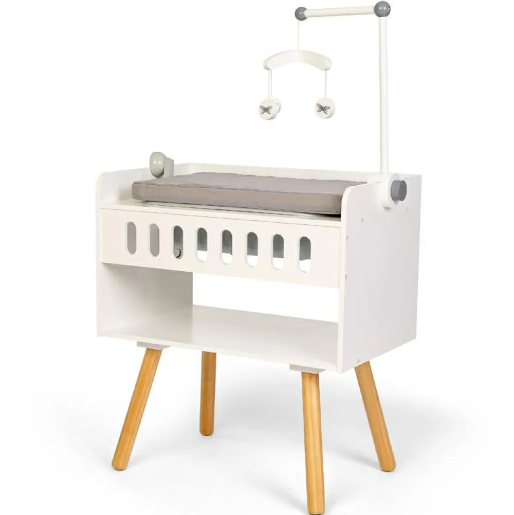 Her kan det lille dukkebarn få et bad i det dejlige badekar, der også har en håndbruser. Efter det dejlige bad kan den lille dukke blive puslet efter alle kunstens regler, og så kan den få fint, rent tøj på på puslebordet og ligge og kigge på den fine uro.