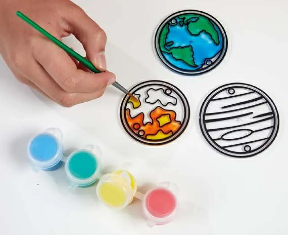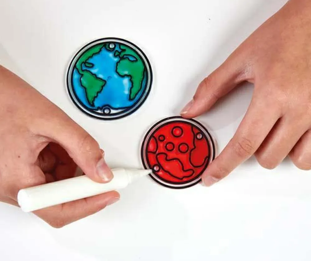 Solsystemets 8 planeter viser sig fra deres smukkeste side, når dit barn maler dem med gennemsigtig maling og tegner kanterne op med selvlysende glow-pen.