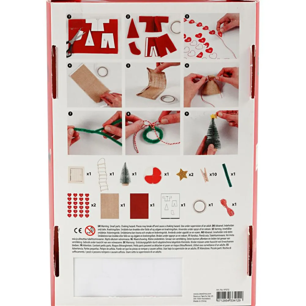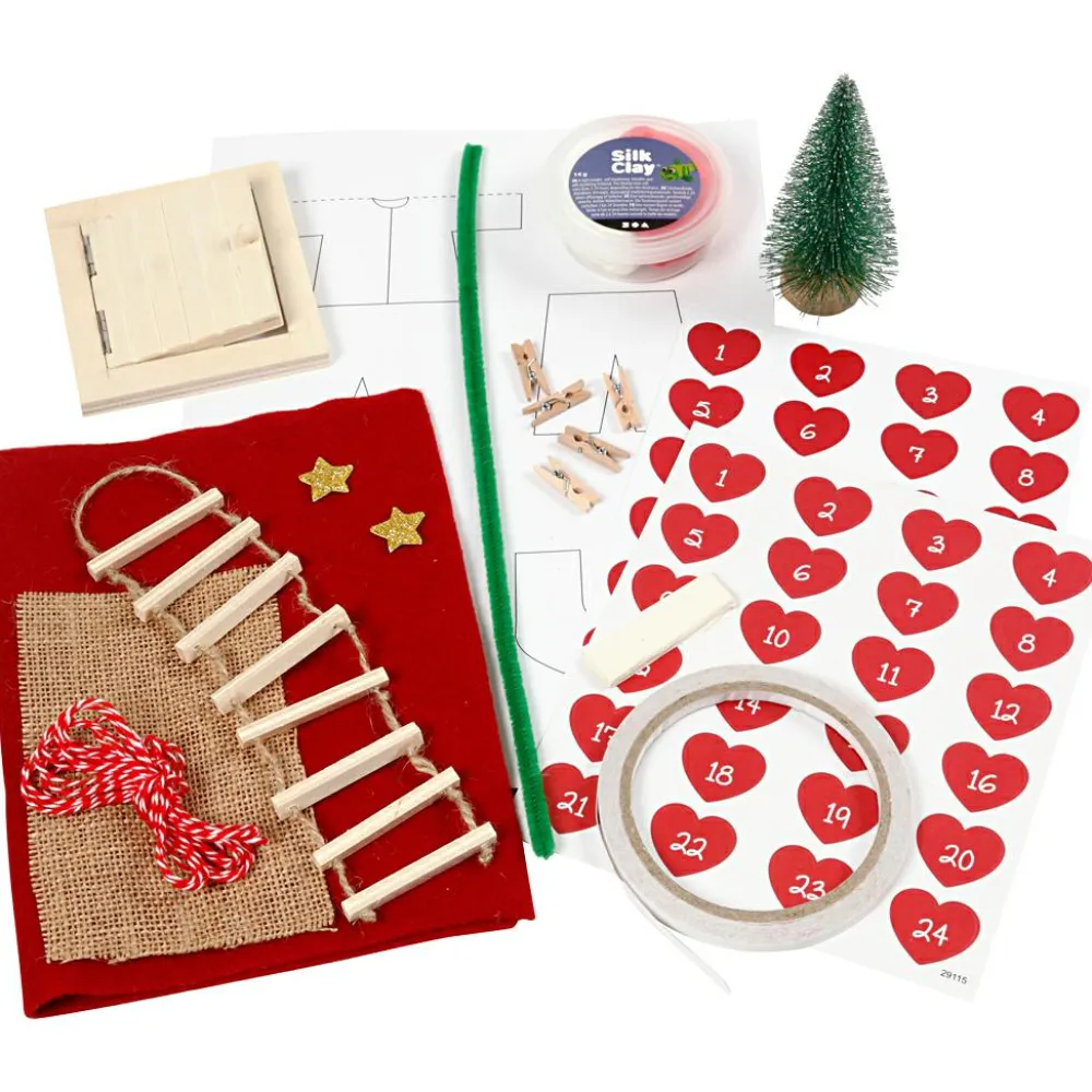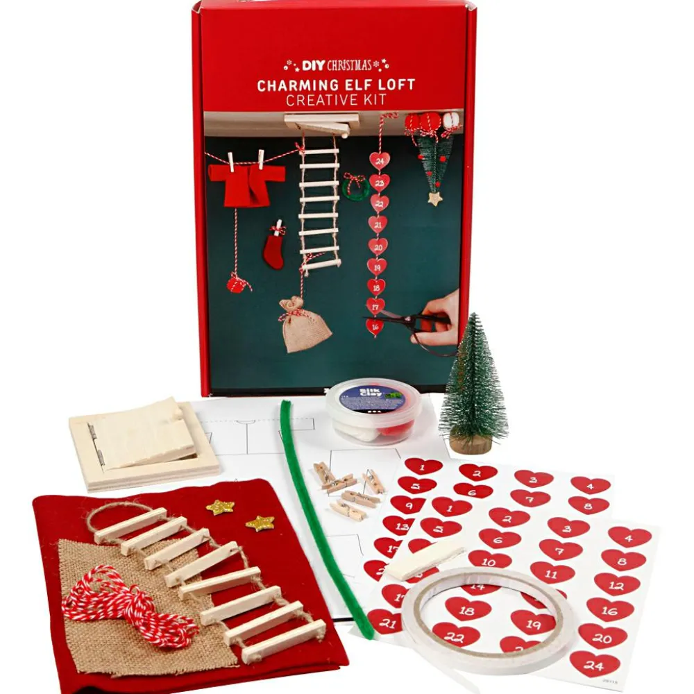 Materialesæt med forskellige emner til et stemningsfyldt og hyggeligt miniature univers for nisser og andre julefigurer: loftlem, rebstige, juletræ, Silk Clay, filt, hessian, stickers, tøjklemmer, chenille, mosgummifigurer, snor, tape og skabelonark.