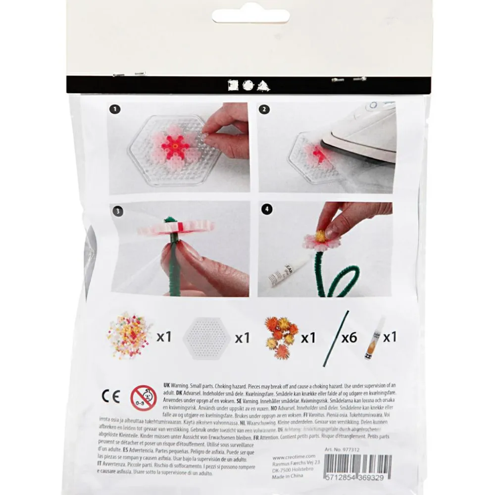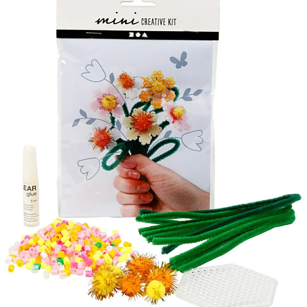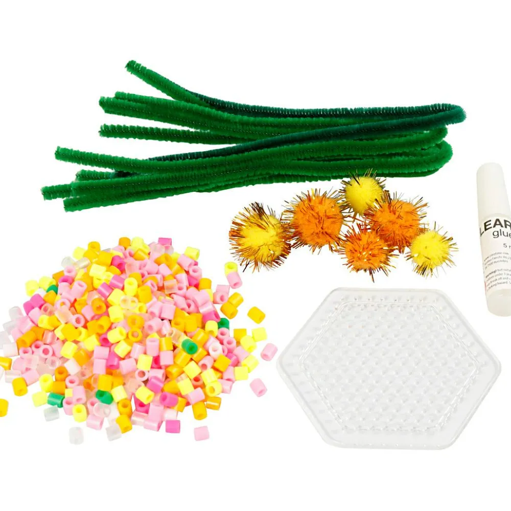 Et meget fint kreativt sæt til en hyggelig forårsstund, hvor I kan lave perlepladeblomster, klistre en pompom fast som støvdrager, og så bøje en piberenser til stilk.