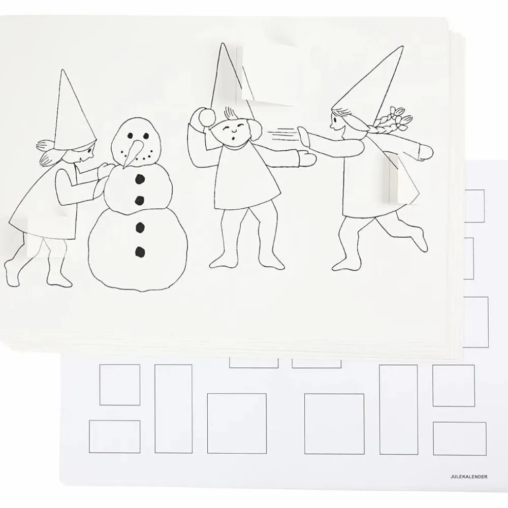 Stort sæt med julekalendere med 24 låger, som ungerne selv kan farvelægge og bestemme indholdet i.