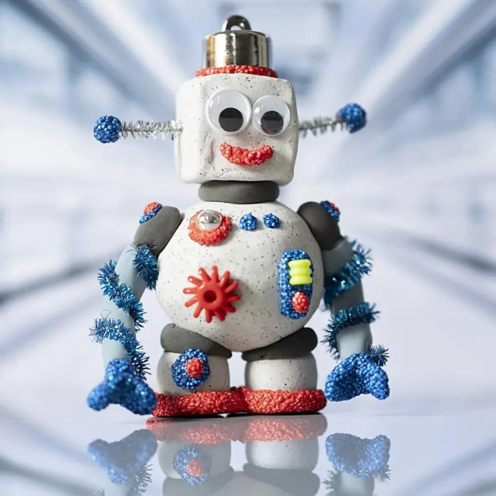 Skab en fin og temmelig stenet robot af stone clay. Hvis massen begynder at tørre ud i emballagen eller mens I arbejder med den, kan I fugte den igen med vand.