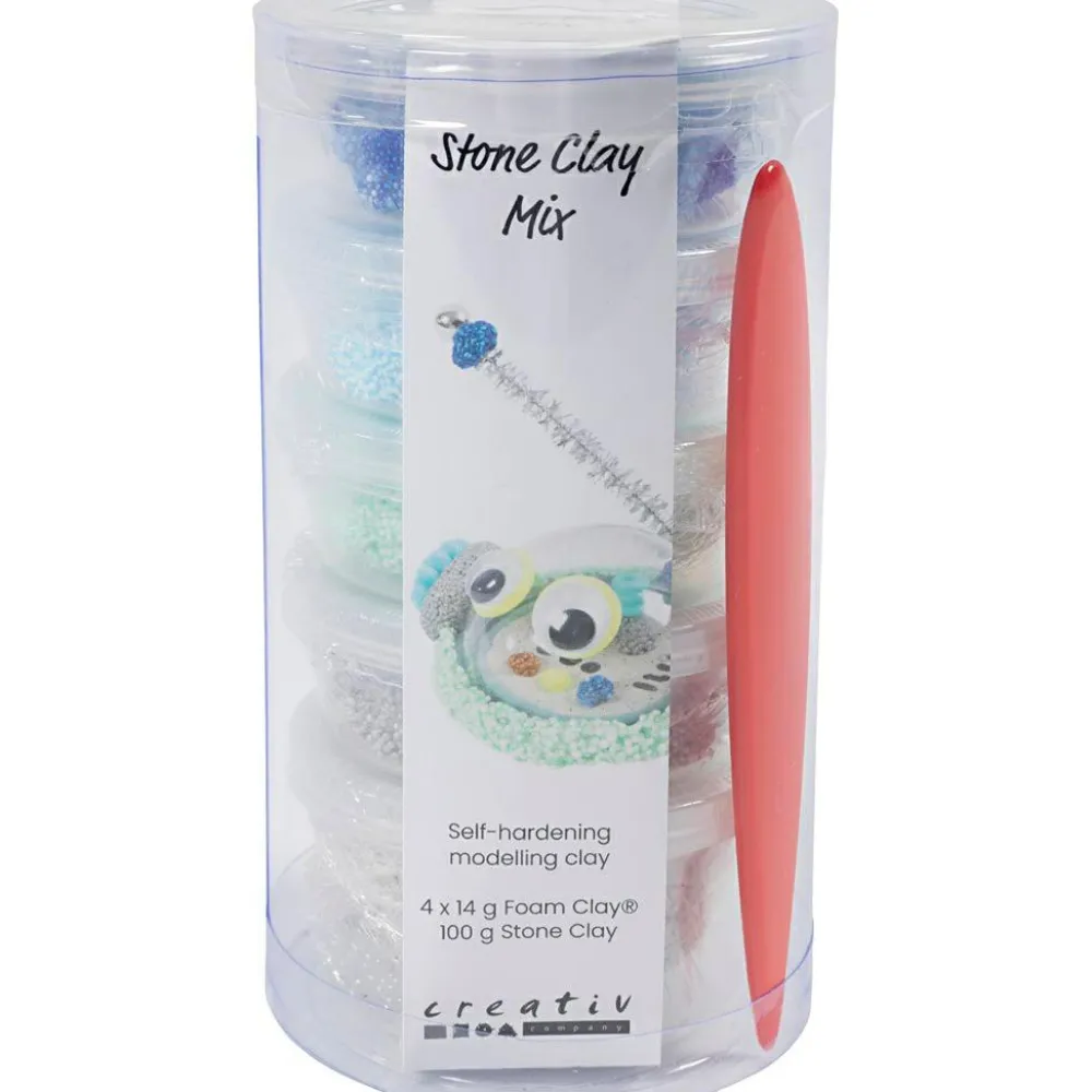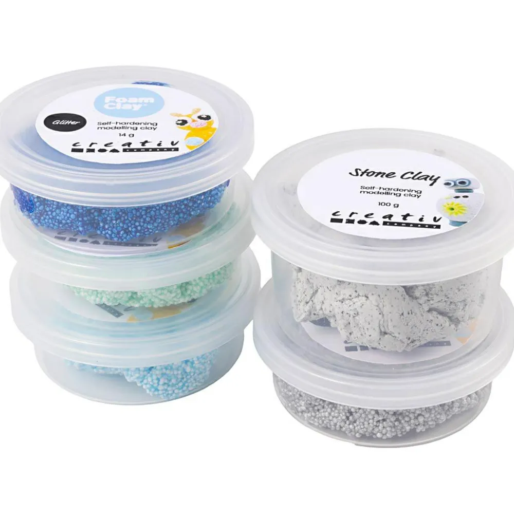 Indhold: 4 x 14 g Foam Clay® i blå, lyseblå, turkis og grå og 100 g Stone Clay, som indeholder stenpulver som giver massen en stenet finish.
