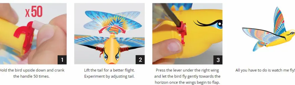 Tim Bird kan flyve ved at du drejer håndsvinget bagerst på fuglen. Inde i “kroppen” er der en gummielastik, som giver flyvekraft til vingerne.