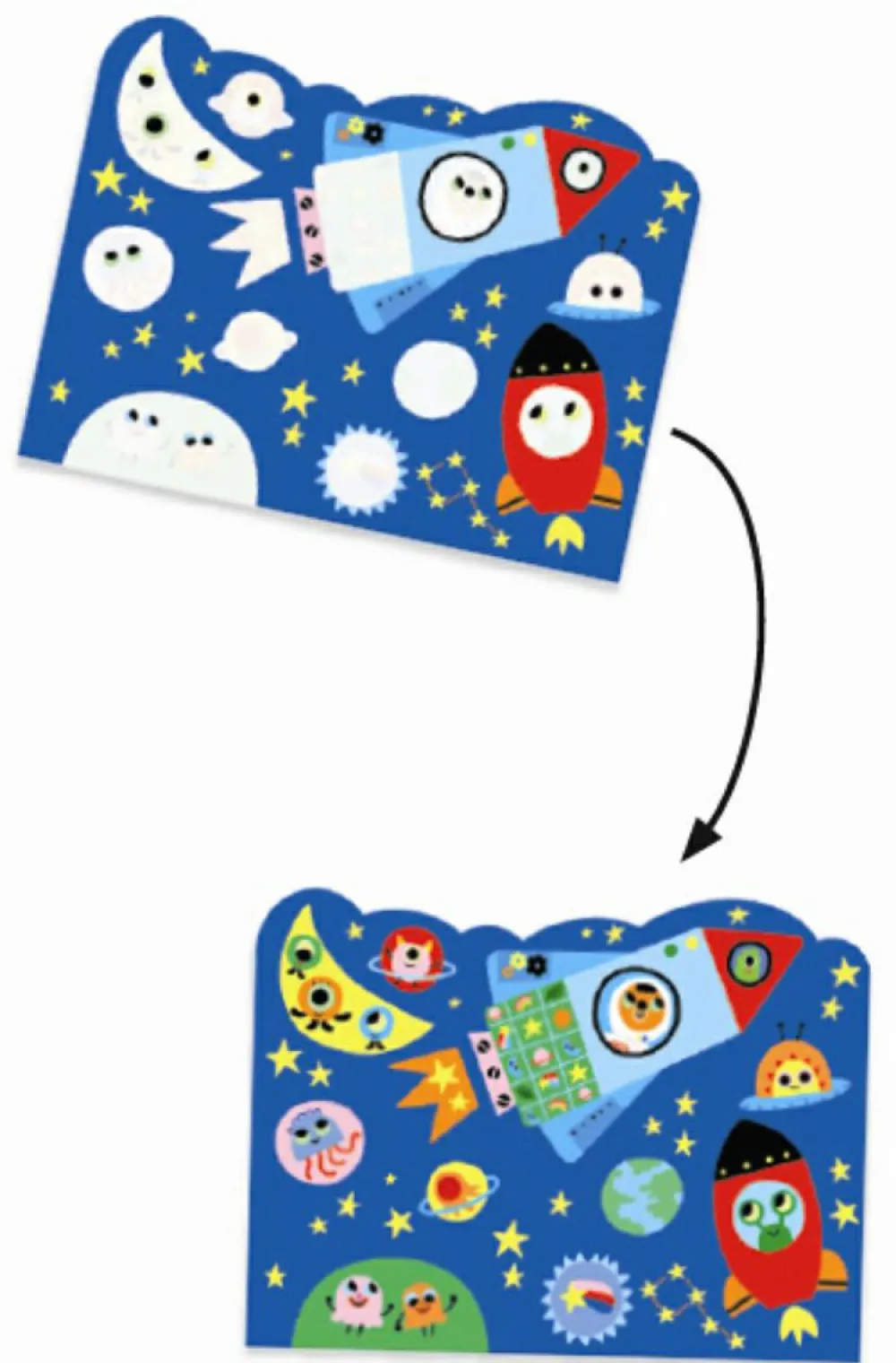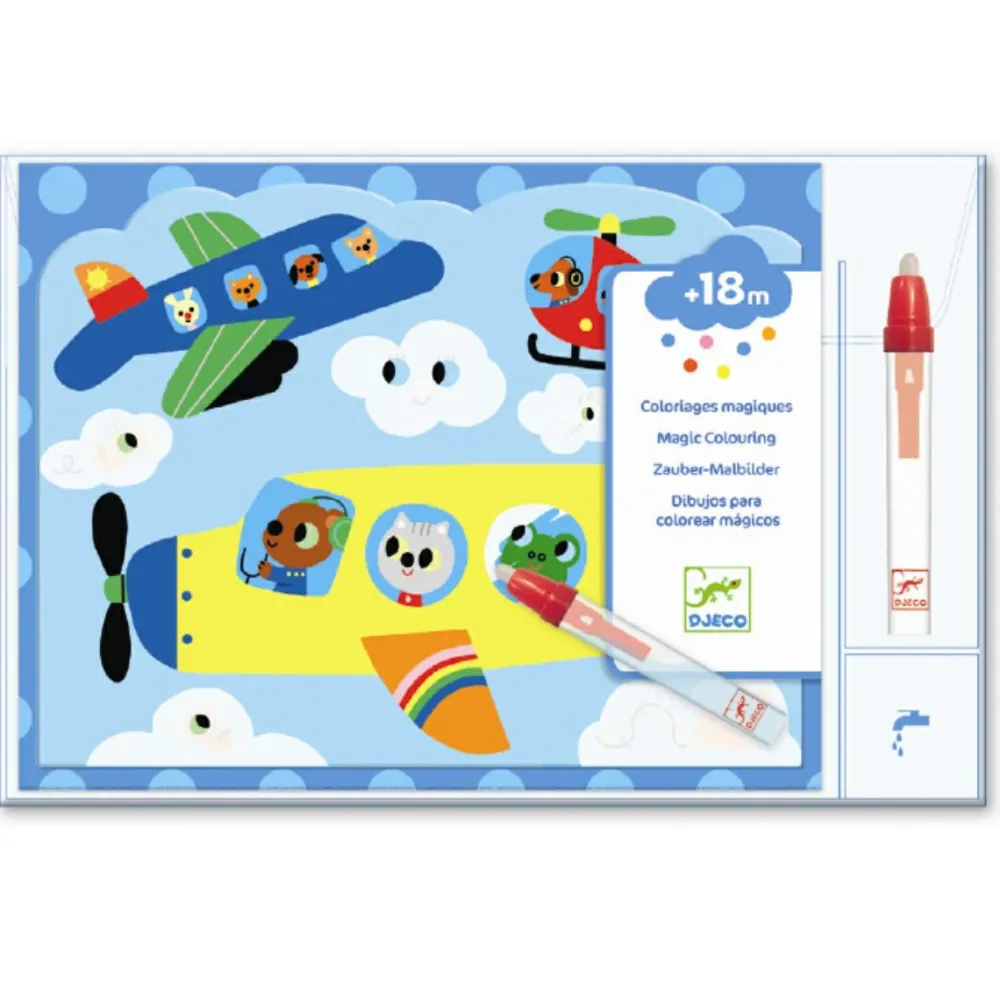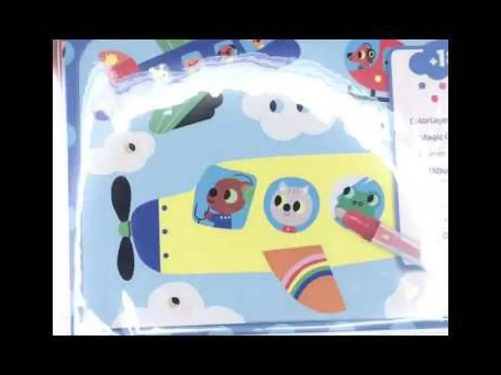 Her er 4 flotte billeder med finurlige motiver fra bl.a. himlen. Fyld vand i den medfølgende pen, og lad så barnet “tegne” på motiverne med pennen. Når de hvide felter bliver fugtige, kommer de flotteste farver frem og vækker det hele til live.