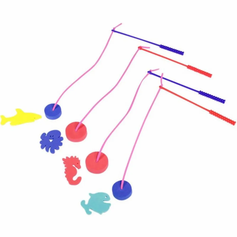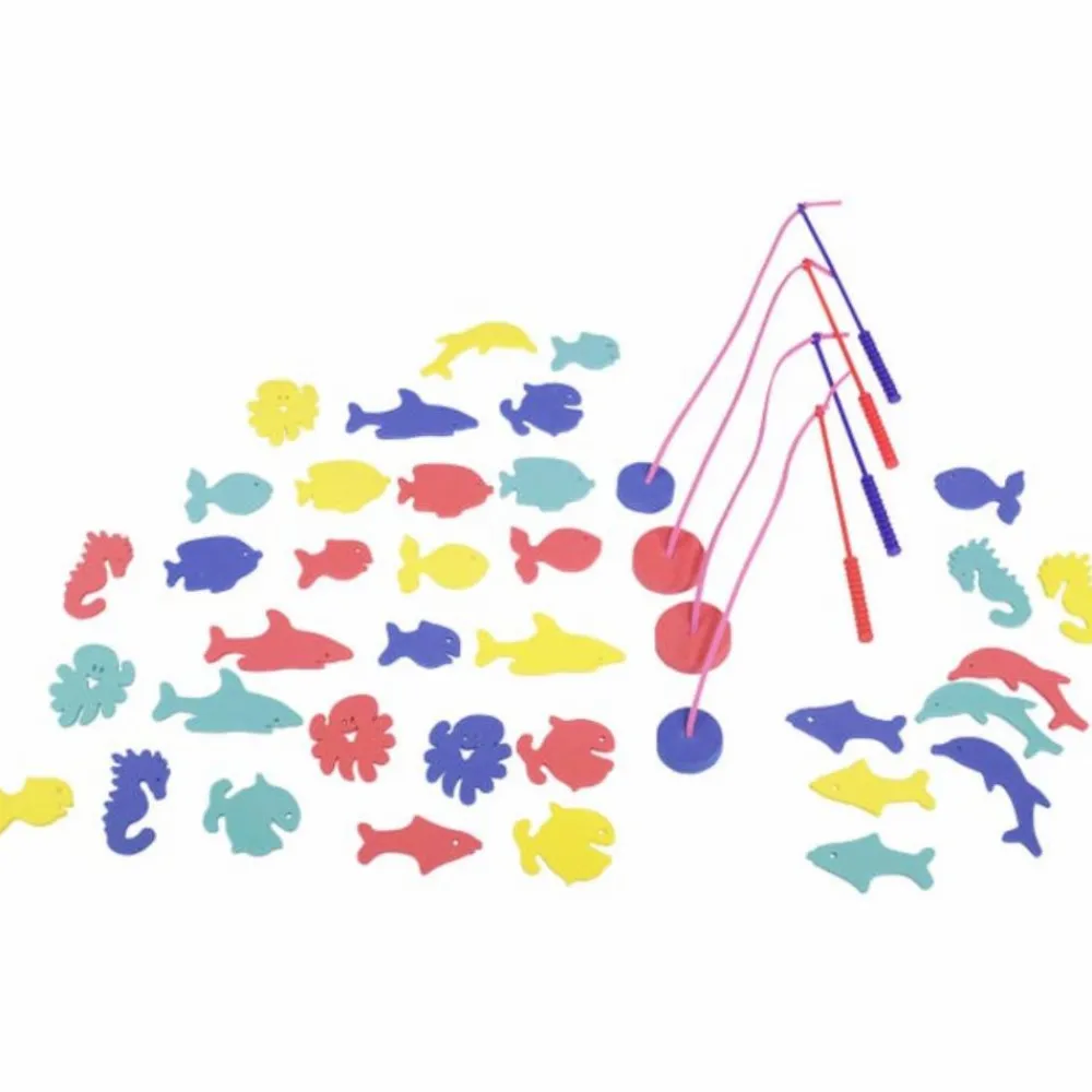 4 fiskestænger og 36 dele at fange. De klistrer sammen, når de er våde.
