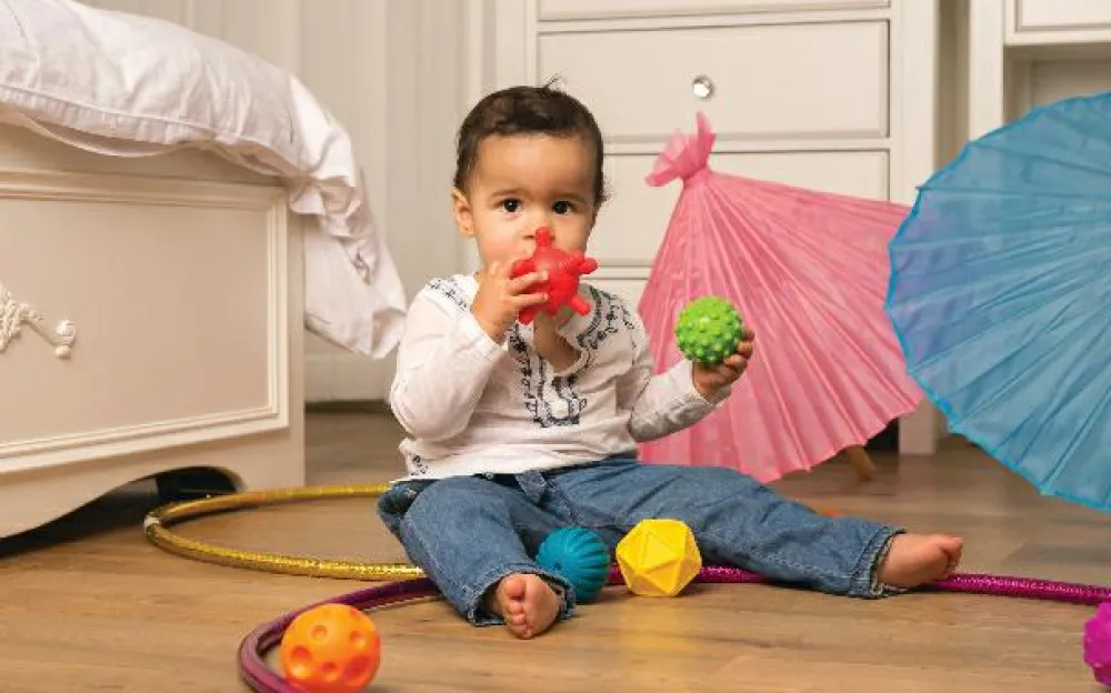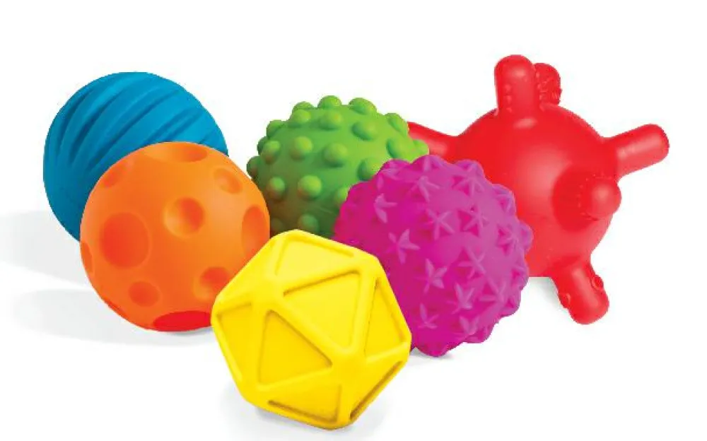 Disse 6 sansebolde er gode at tygge og gumle på til de små, der er ved at få tænder.
