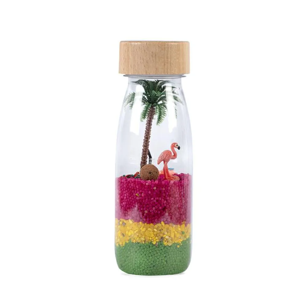 Fald til ro, kom i feriestemning og tag en pause med at vende og dreje flasken se og hør flamingoen, kokosnøden og de andre dele rasle rundt derinde.