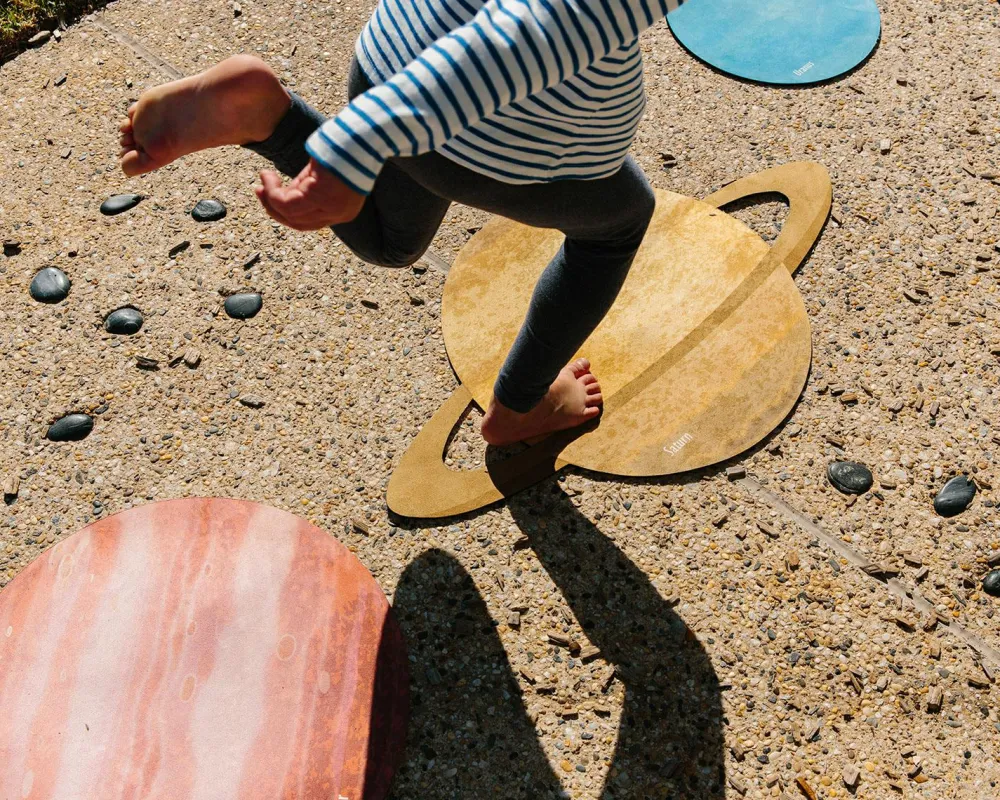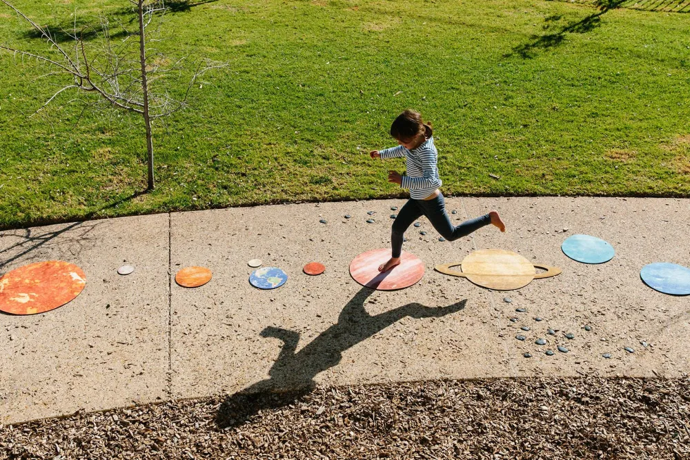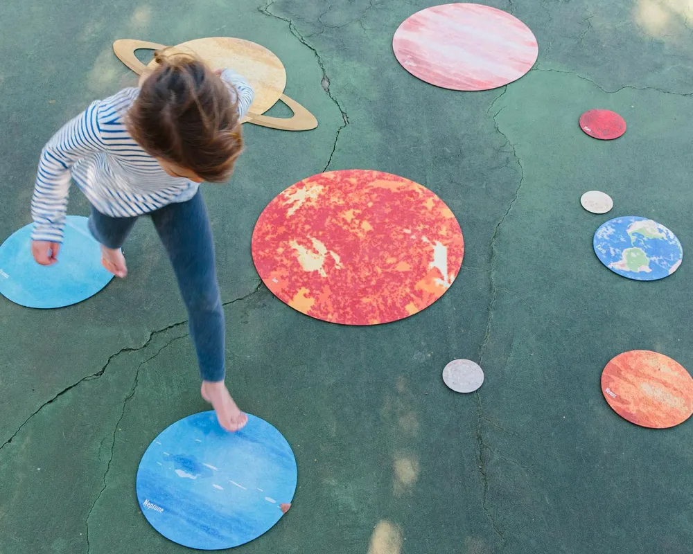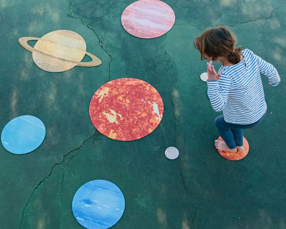 Sæt fut i dit barns grovmotorik ved at sprede vores solsystem ud på terrassen, gårdspladsen, indkørslen eller andre steder.