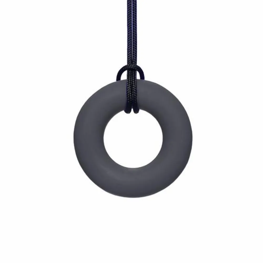 Ringen hænger i en halskæde og er en diskret måde, dit barn kan stille sit behov for at tygge.