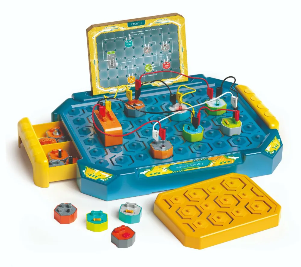 Over 20 elektriske kredsløb på forskellige sværhedsniveauer, 10 udfordringskort med forskellig sværhedsgrad og elektriske komponenter og moduler. Nogle af dem er samlet på forhånd, andre skal I selv samle.