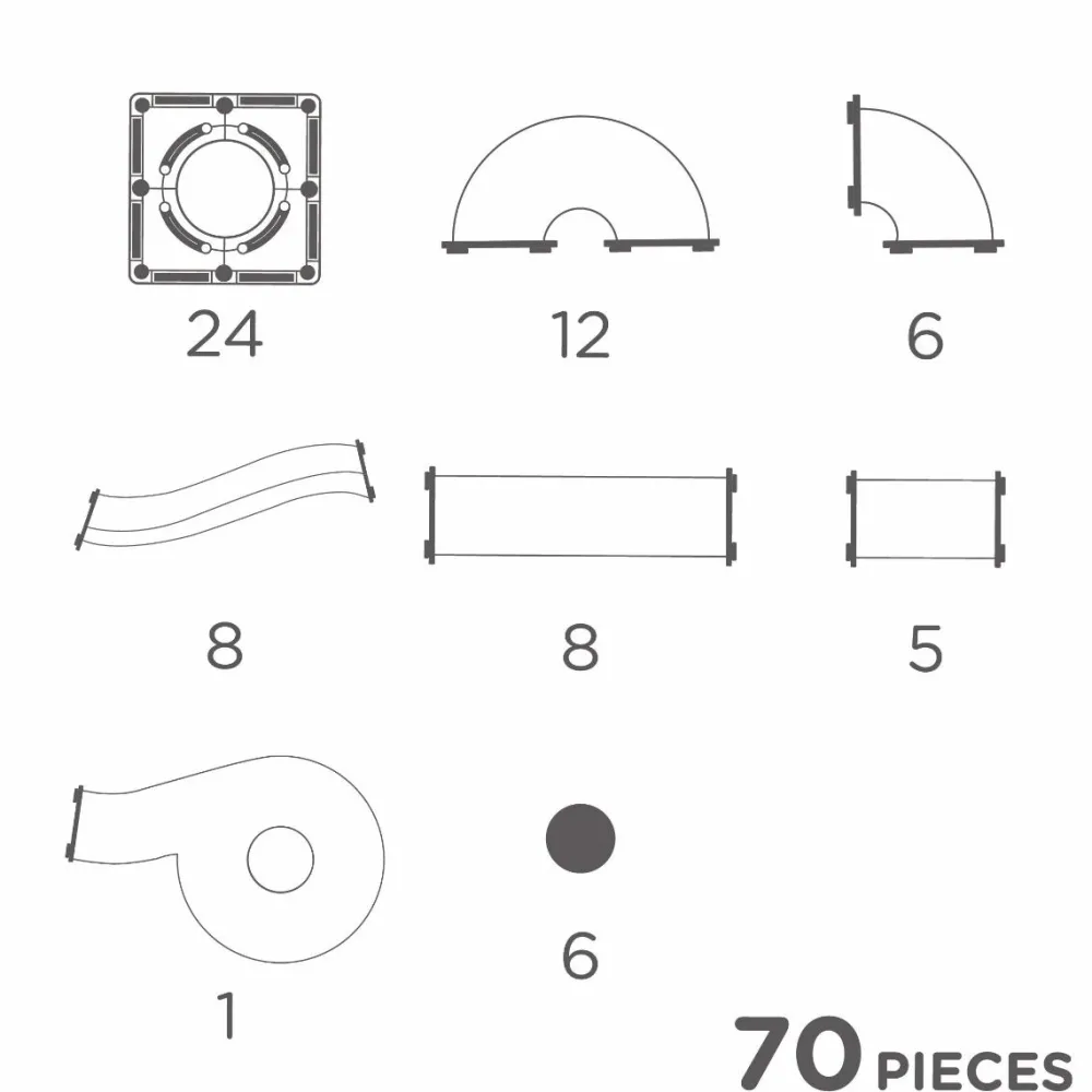 En fin, mindre kuglebane, som dit barn selv kan bygge enten ved hjælp af frie, snørklede tanker i fantasien eller ved hjælp af de mere skematiske metoder i den medfølgende byggeguide.