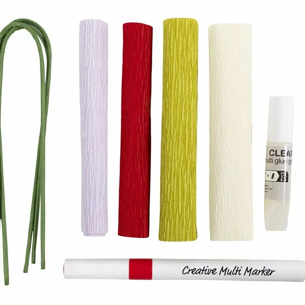 Det lille sæt indeholder alt du eller dit store barn skal bruge for at komme i gang og skabe 3 fine crepepapir blomster: