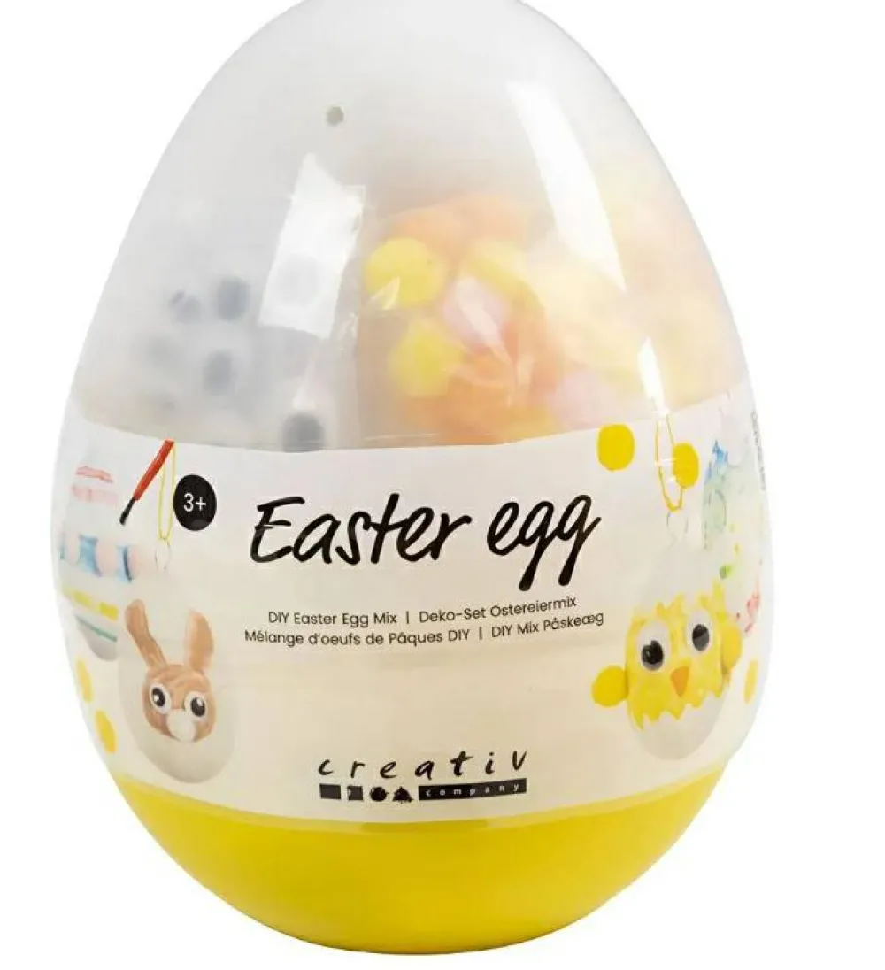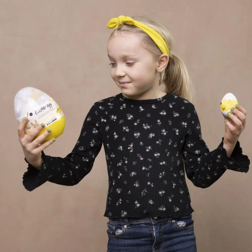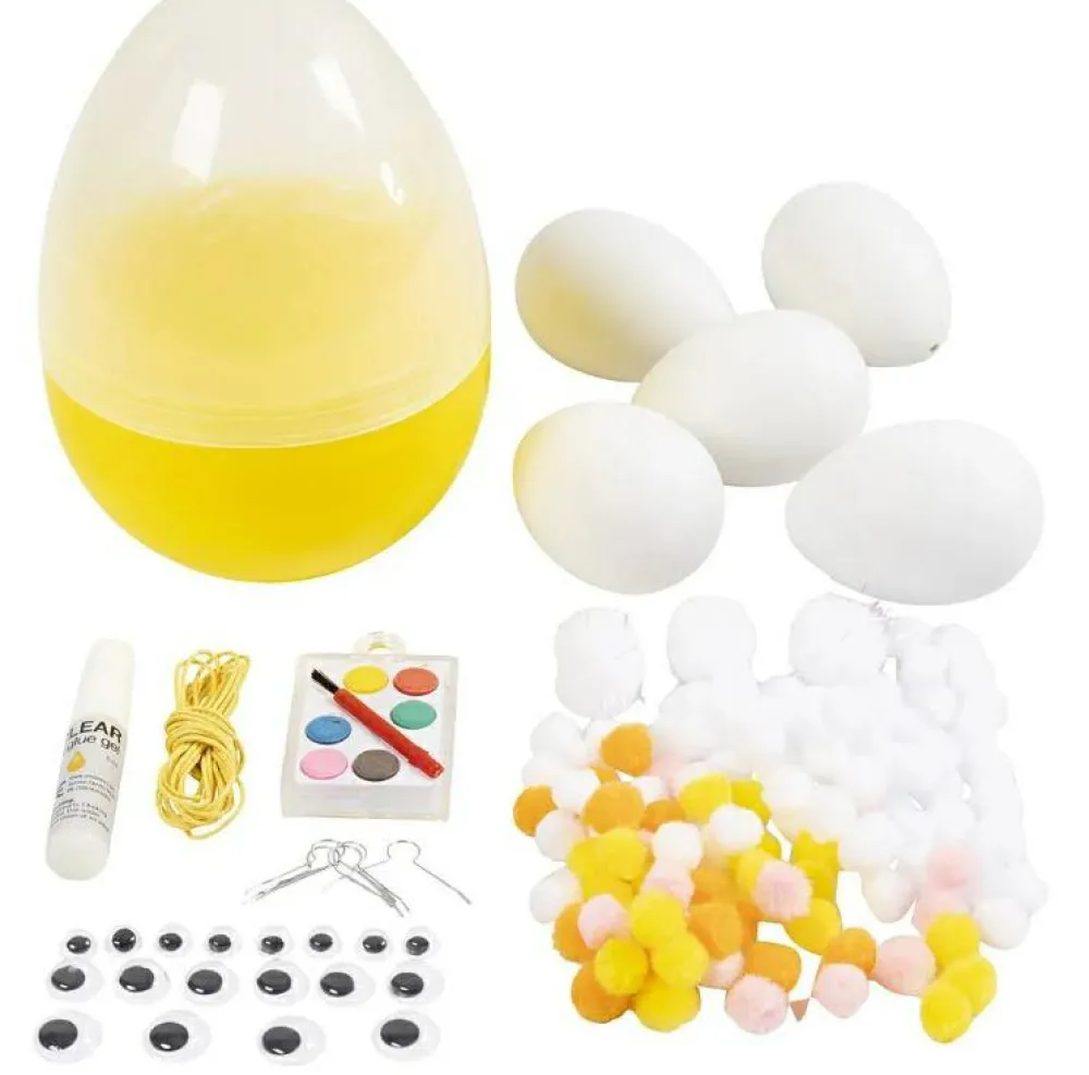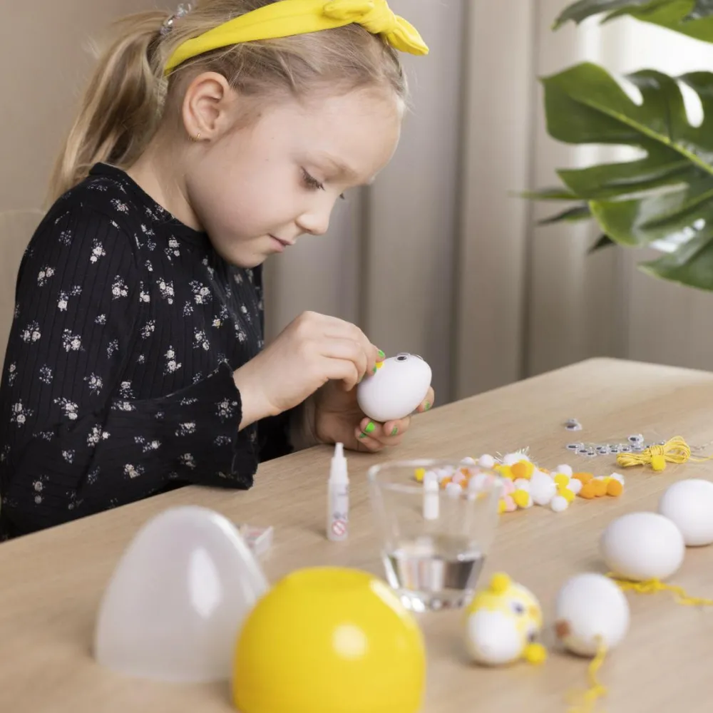 Med sættet her kan du og dit barn fx farvelægge påskeæg, eller med lidt tålmodighed lime påskekyllinger og harer sammen af pomponer og give dem rulleøjne.