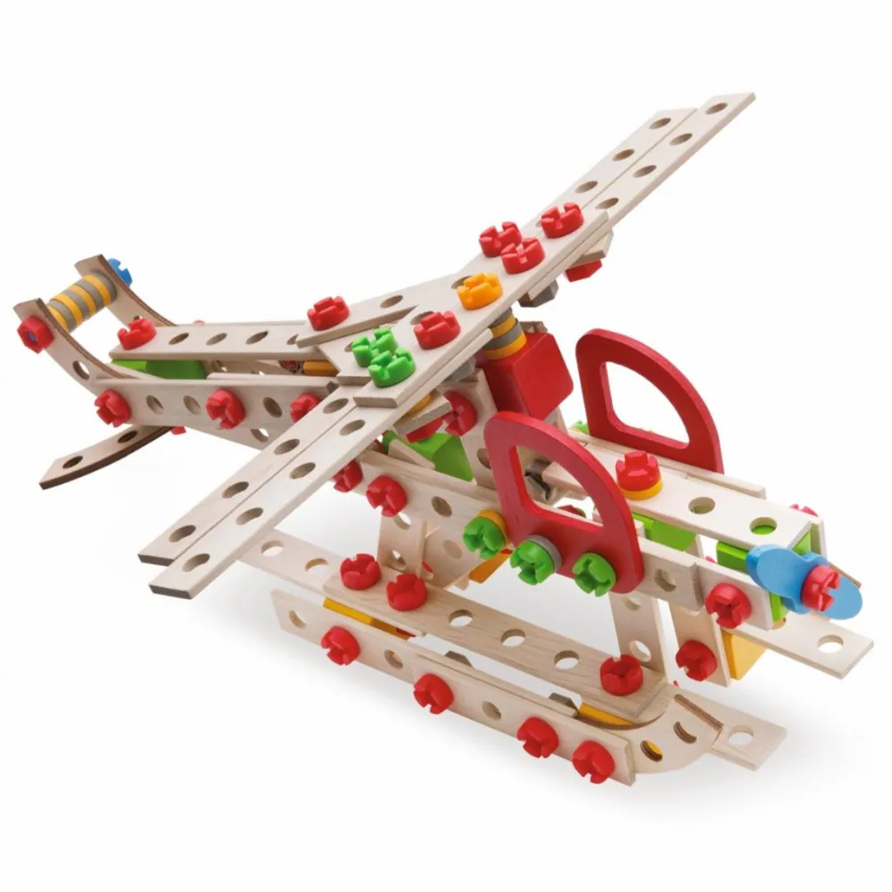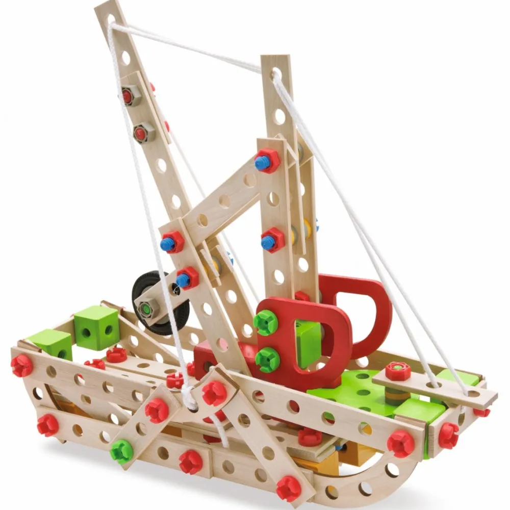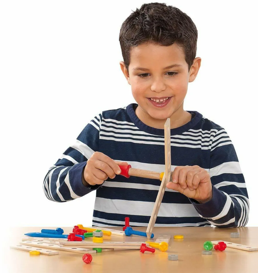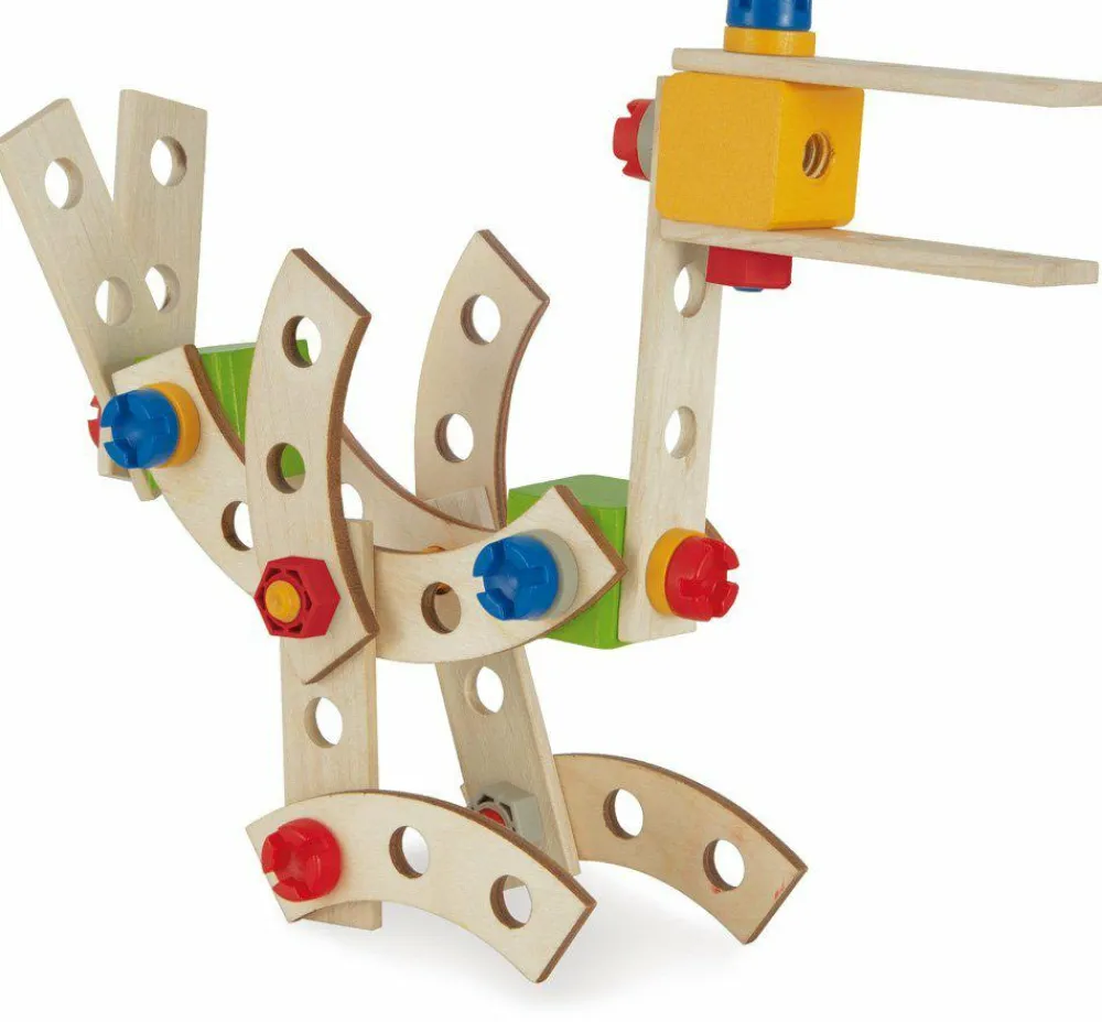 En kæmpe spand med masser af træelementer, skruer og møtrikker, som vil få det til at klø i de små fingre og sætte fantasien i gang.