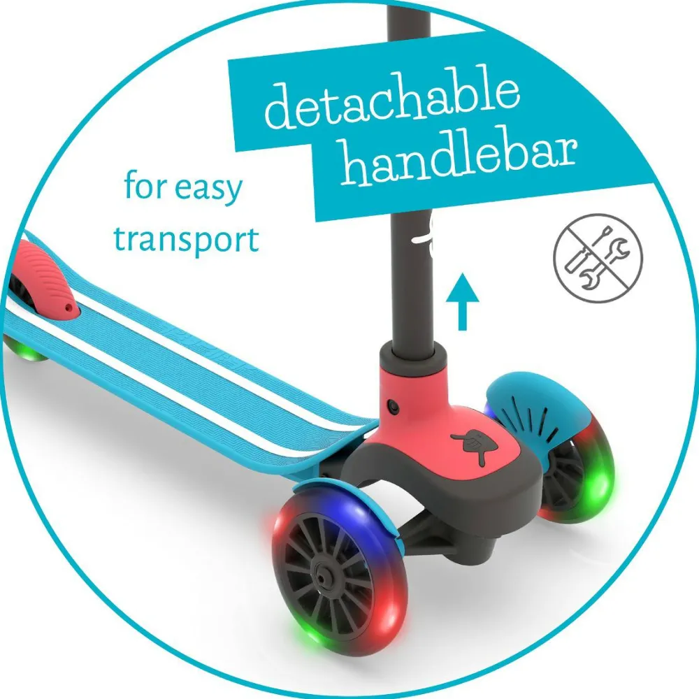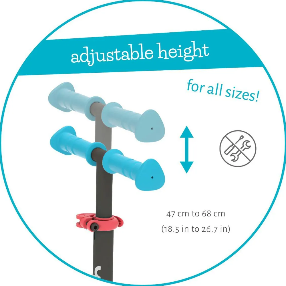 Styret kan justeres i tre højder og nemt tages helt af. Det gør løbehjulet nemmere at transportere eller tage med indenfor.