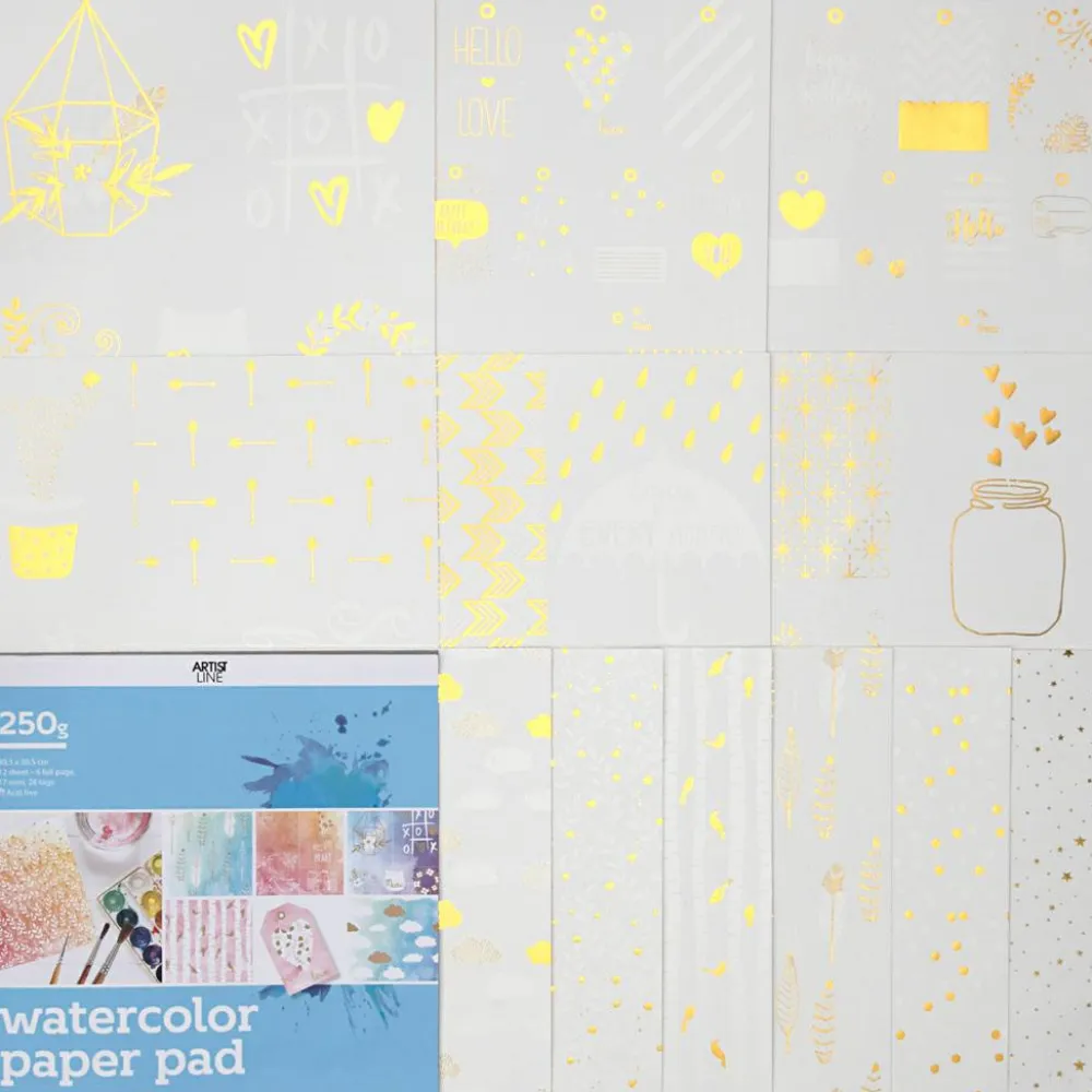 Blok med akvarelpapir trykt med motiver i guldfolie og hvid lak til at farvelægge med vandfarver. Herved blokerer motiverne for gennemtrængning af farver, og de træder tydeligt frem.