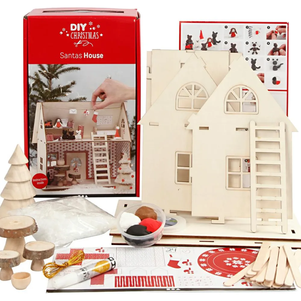 Indhold: Saml-selv hus af lyst træ, møbelsæt, juletræer, fad og ispinde, alle af træ. Lim, tråd, kunstig sne, Silk Clay samt interiør dekoration af papir. Sæt med saml-selv hus af træ. Hertil forskellige materialer til at lave en udstilling med julemandens hus.