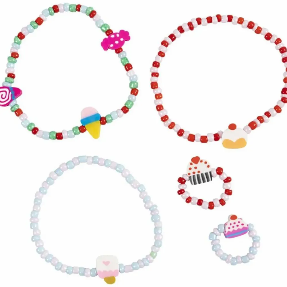 I ender med meget fine elastikarmbånd og fingerringe pyntet med lækkerheder for slikmunde, når I følger video-vejledningen, som følger med i dette sæt.