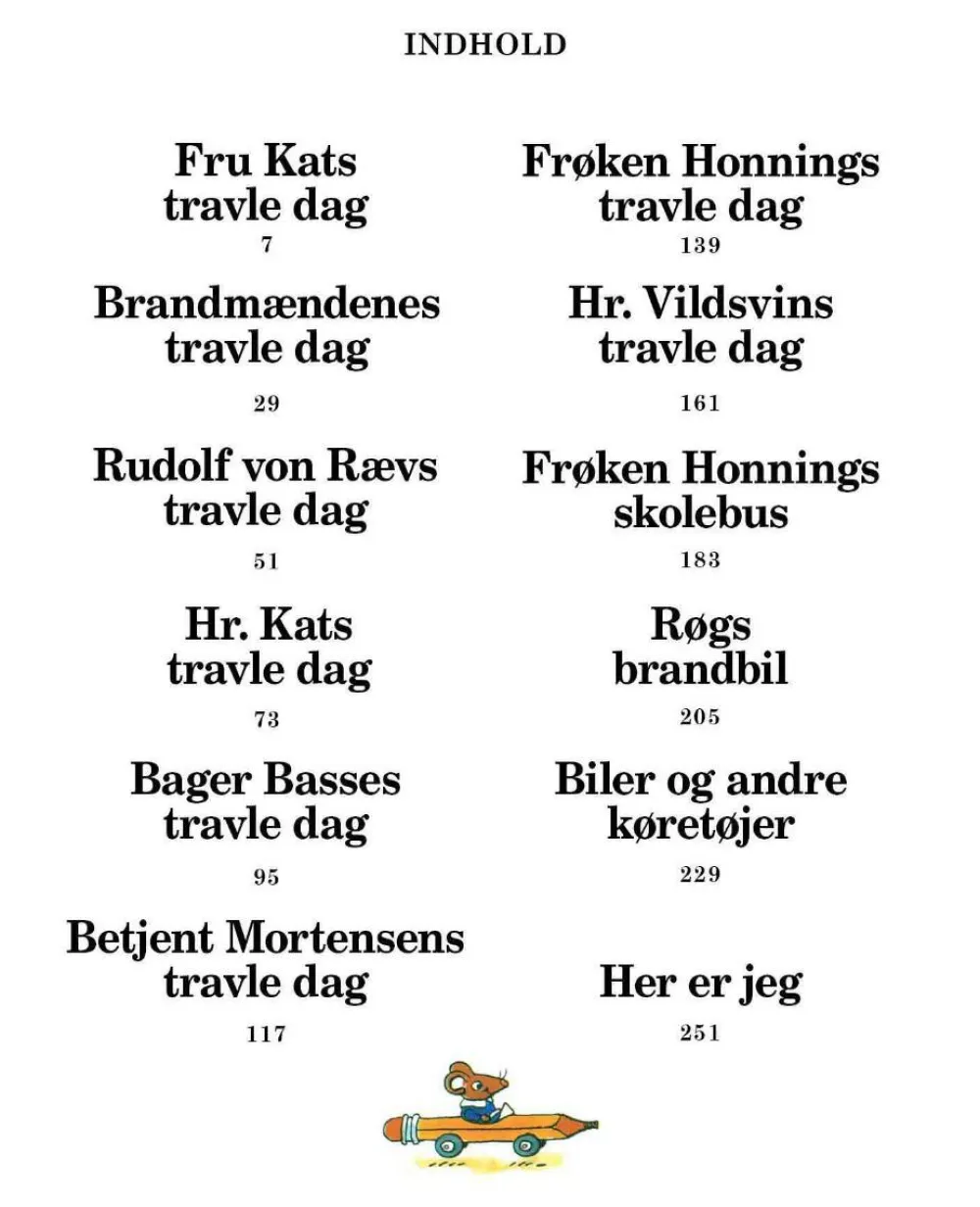Obligatorisk bog for familier med læse-højt kløe. 12 dejlige, klassiske Richard Scarry historier samlet i en bog fuld af hans vidunderlige og humøristiske tegninger af Bager Basse, Fru Kat, Frk Honning, brandmændene og mange flere personer fra hele Scarry-galleriet.