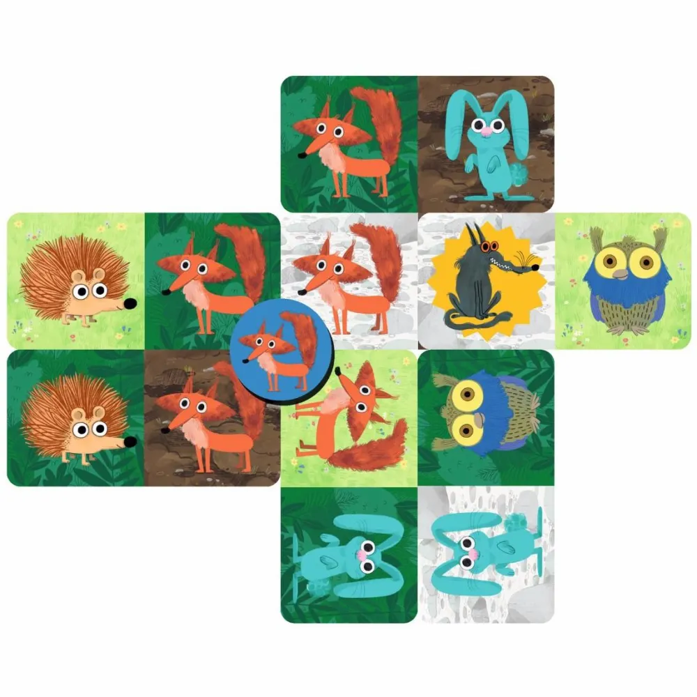Her skal I samarbejde om at vinde spillet. Det gælder om at skiftes til at trække et kort med et dyr fra bunken og så få lagt dyrene i grupper af 5 ens dyr – fx 5 ugler. Udfordringen er, at kort med den samme baggrund ikke må støde op mod hinanden.