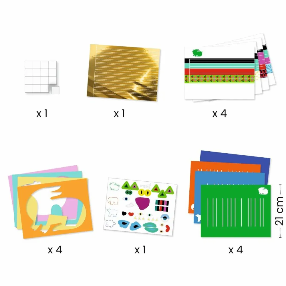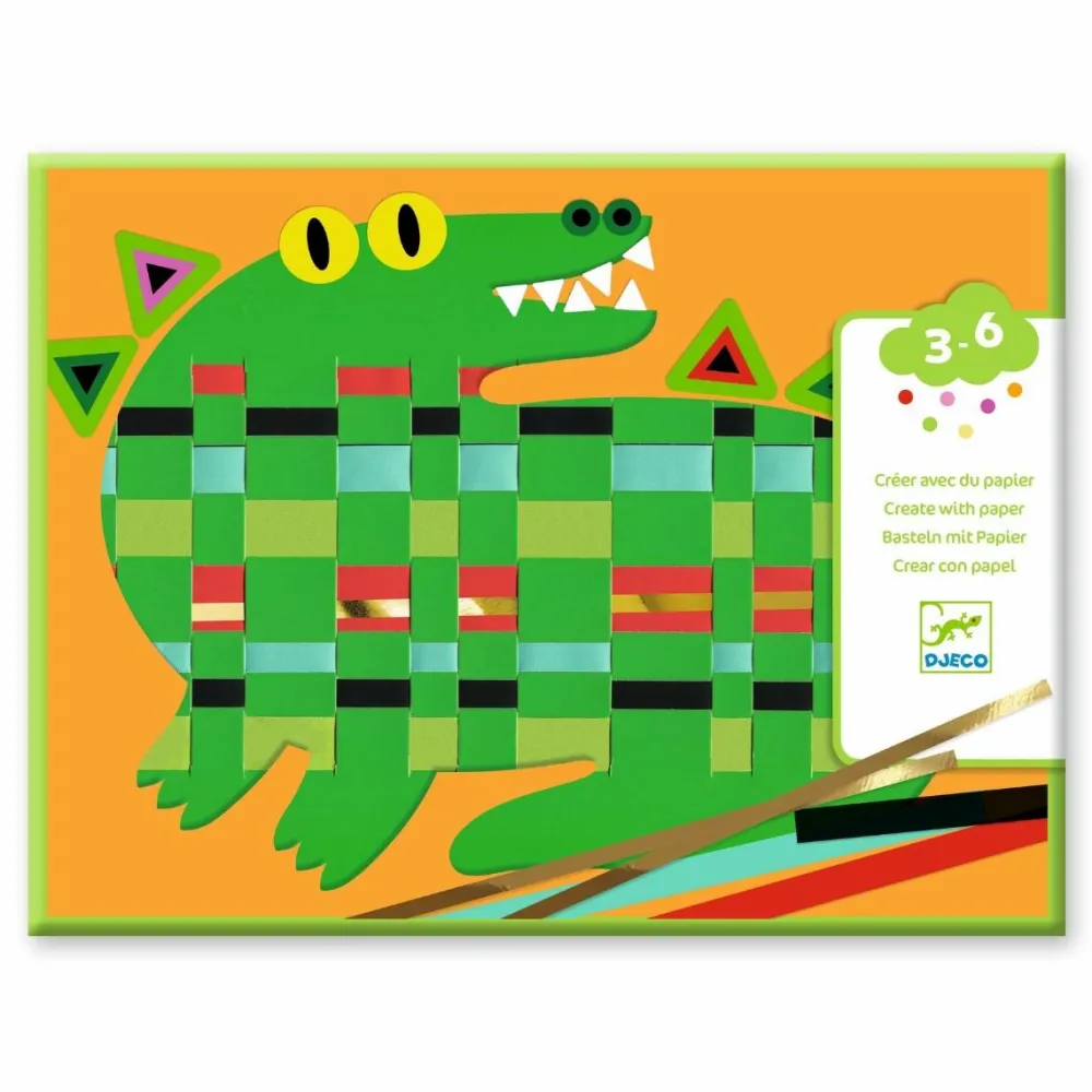 Det minder lidt om at flette julehjerter sammen og så alligevel ikke, for her skal de kulørte strimler væves ind i de fire ark. Bagefter kan de vævede ark få en dyreskikkelse på og til sidst pyntes med klistermærker og blive rigtig fine – eventuelt med lidt hjælp fra en voksen på sidelinjen.