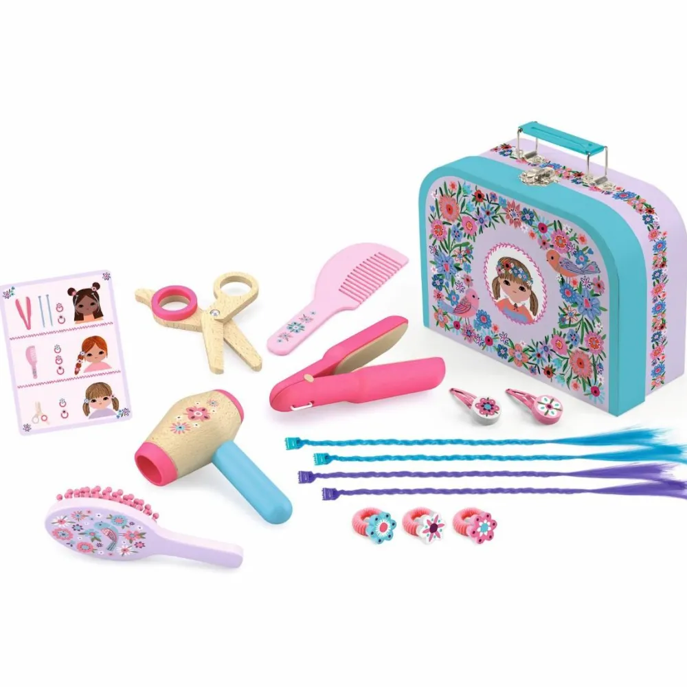 Hårbørste, glattejern, saks, kam, extensions, 3 elastikker, 2 spænder, hår-idekort.