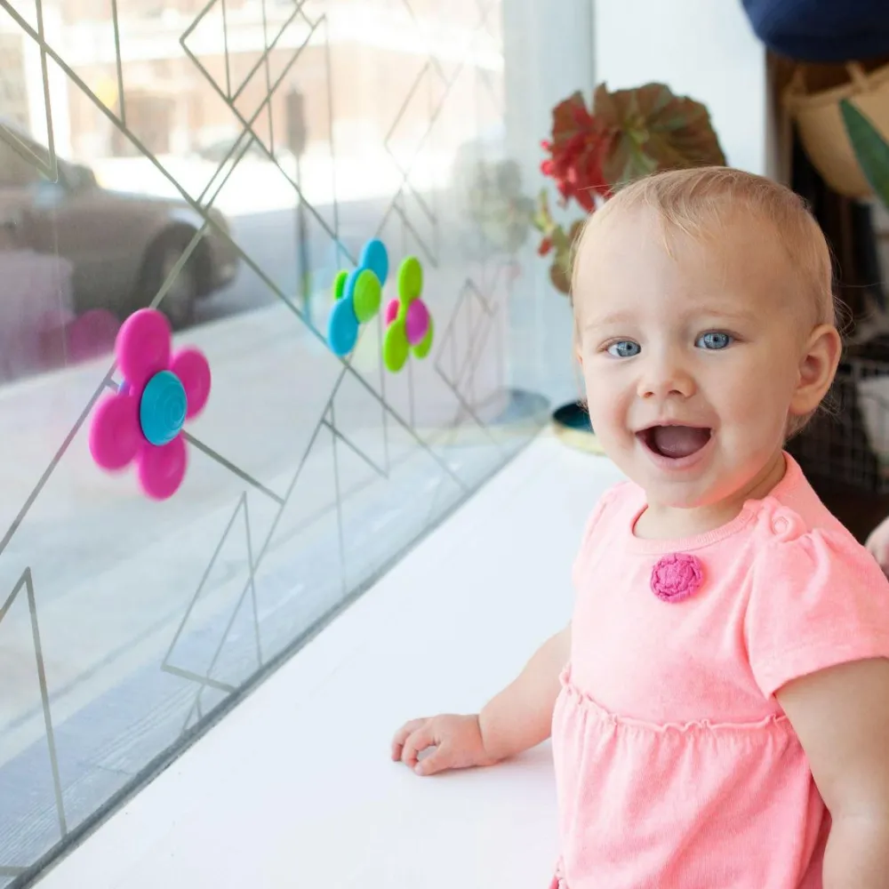 Sjove, små Fidget Spinnere til de mindstes hænder med den lille fordel, at de kan sættes fast på glatte flader med en sugekop, der sidder på bagsiden.