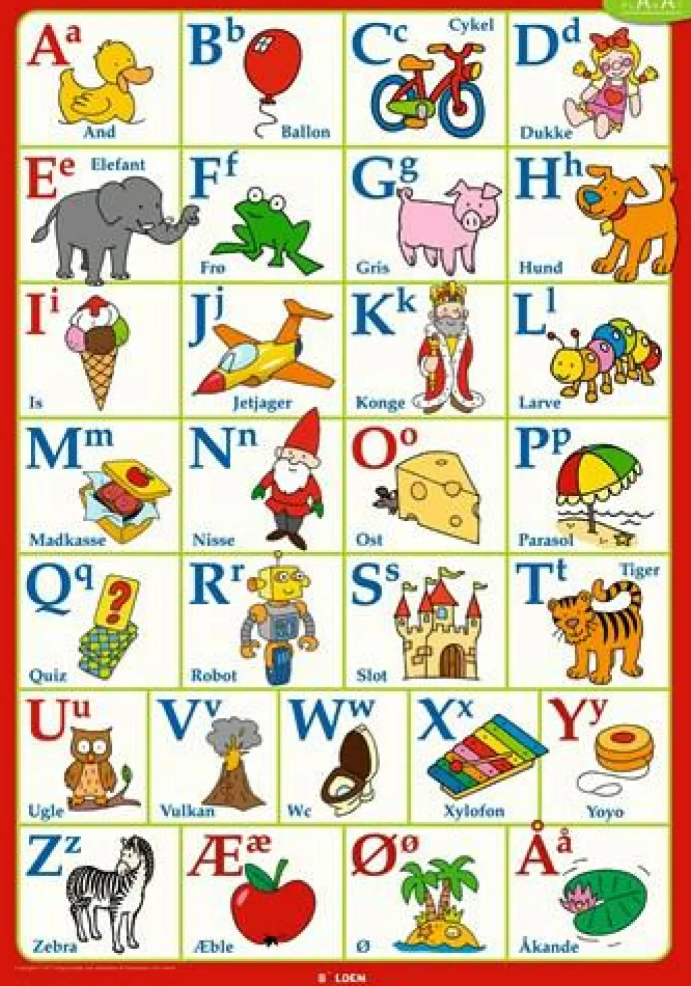 Den er flot, lamineret, stor og har både tegninger, store og små bogstaver og ord, der relaterer sig til den enkelte tegning og bogstavet, som tegningen starter med.