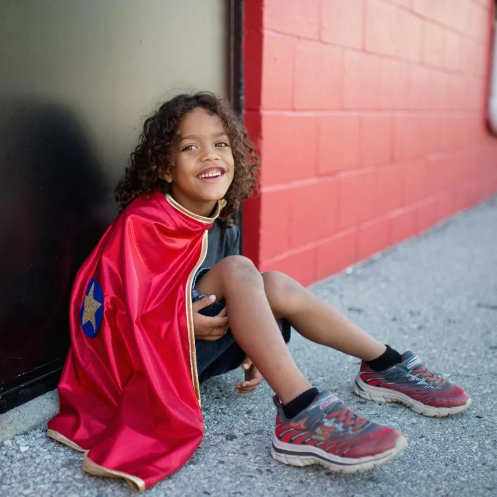 Denne smarte udklædningskappe er vendbar, så dit barn selv kan vælge, om den røde side eller siden med guldfarve skal vende udad.